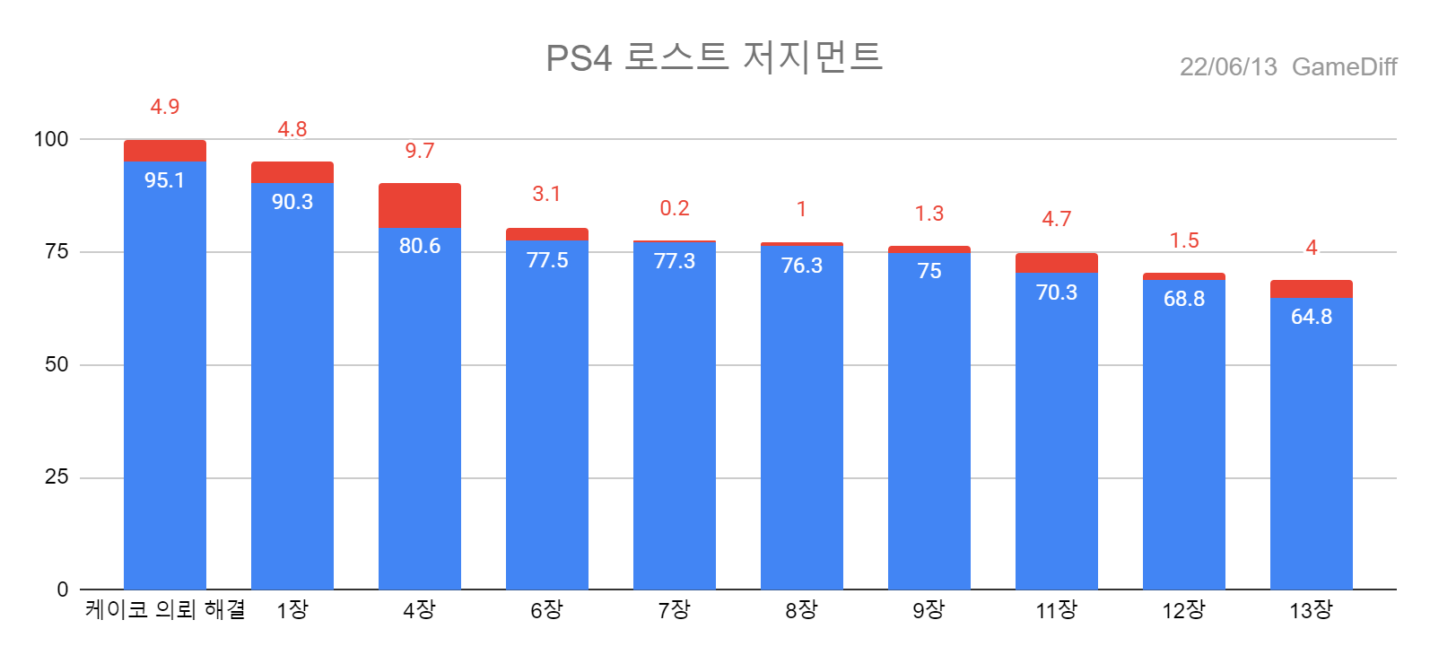 후반부에 눈에 띄는 구간은 11장 부분입니다. 업적이 11장 완료기 때문에 실제 플레이 구간으로는 10장 ~ 11장입니다. 이 부분의 플레이타임이 10장 2시간, 11장 1시간으로 총 3시간 정도로 7~9장 합쳐서 2시간 정도인 것에 비해 긴 편이긴 합니다. 그래서 시간당 이탈률로 보자면 딱히 큰 차이가 있지는 않지만, 일반적으로 중반 이후부터는 이탈이 잘 늘어나지 않는 편인 걸 생각해 봤을 때 문제가 없지는 않다고 봐야겠네요.