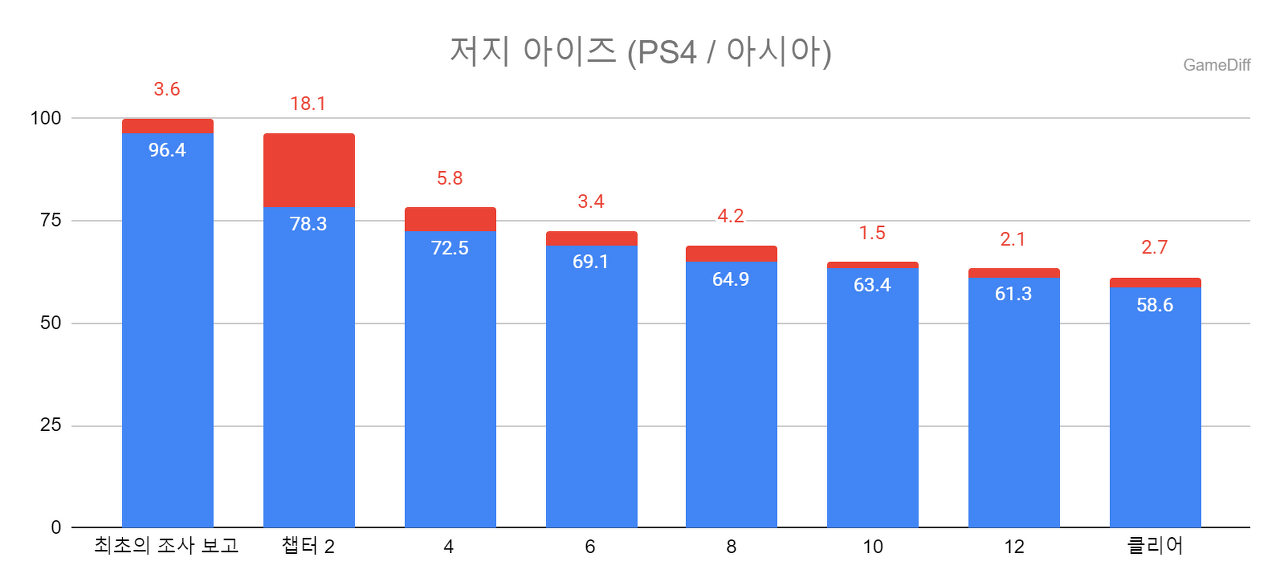 특히나 더 대단한 건, 위의 저지 아이즈 자료가 아시아 한정 자료인데, 로스트 저지먼트는 전세계 자료라는 점입니다. 위에 링크로 넣은 저지 아이즈 글을 보시면 아시겠지만, 비아시아 지역에서는 이탈률이 엄청 납니다. 그런데 그걸 통합하고도 저렇게 준수한 자료가 나왔다는 건, 아시아만 보자면 훨~씬 더 좋아졌다고 생각해 볼 수도 있습니다. 물론 그만큼 서양에는 안 팔리기 때문에 합쳐도 변화량이 거의 없을만큼 미미하다 라고 해석할 수도 있긴 합니다만... 뭐.. 네... 뭐 그렇습니다.