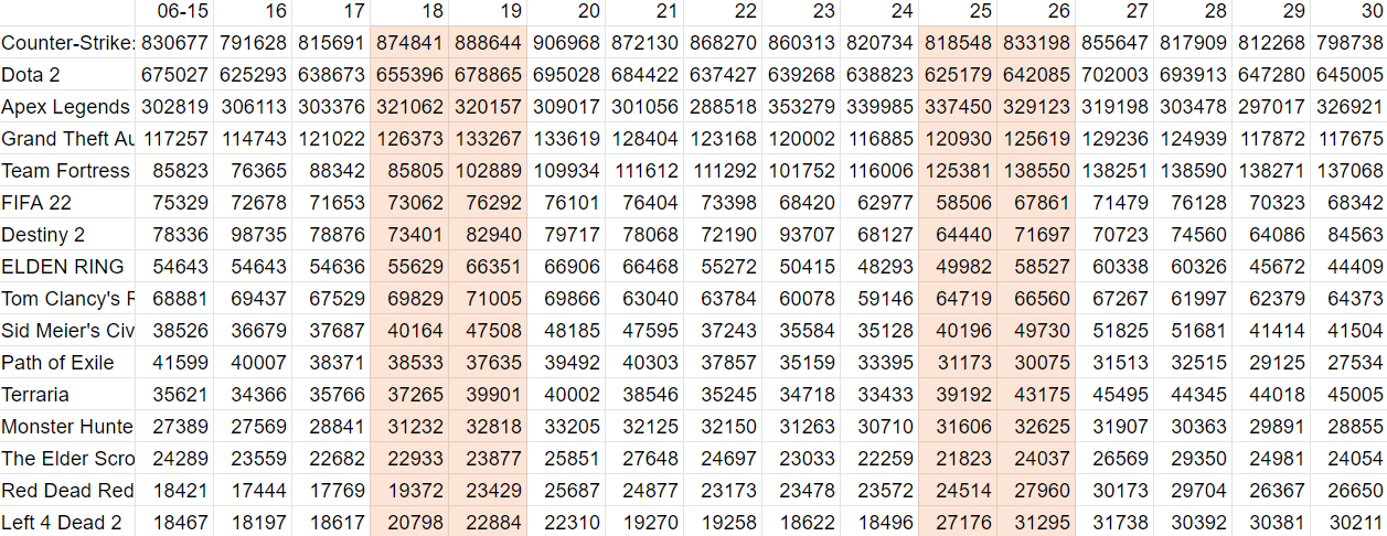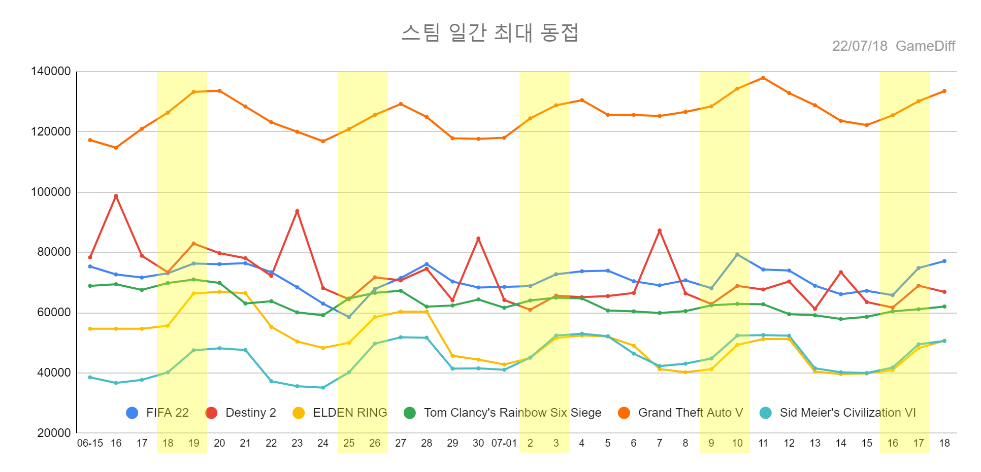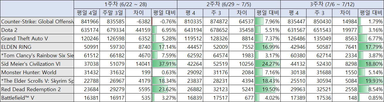 주말에 동접이 폭발적으로(?) 늘어나는 게임은 엘든 링, 문명 6, 스카이림, 레드 데드 리뎀션 2입니다. 이름만 들어도 얘네들의 공통점이 단번에 떠오르네요. 플레이타임이 긴 데다 몰입도가 아주 높은 싱글 중심 게임이죠. (레데리2는 온라인이 있기는 하지만 영향력이 큰지는 잘 모르겠습니다. 또 나중에는 온라인 분리되기도 했고 말이죠.) 그렇다보니 평일에 자잘하게 끊어서 하기보다는 주말에 몰아서 하겠다 이런 사람들이 많아서 이런 결과가 나온 게 아닐까 싶습니다.