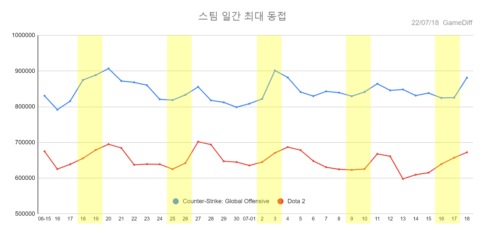 스팀은 동접 기준 100위까지의 동접자 수를 공개하고 있습니다. 하지만 동접자를 국가별로 구분해서 확인할 수는 없습니다. 그래서 한국 날짜 기준으로 보면, 시차 때문에 주말이 차이가 나기 때문에 사실 정확하게 주말과 평일의 동접 차이를 확인할 수는 없습니다.