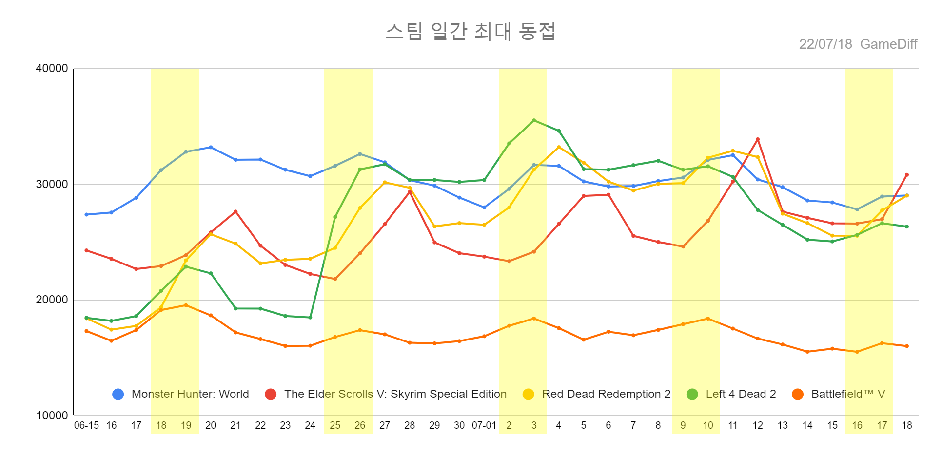 *대부분의 게임이 주말 3일은 한국 기준 일월화 지만, 예외적으로 레인보우 식스 시즈는 토일월, 스카이림은 월화수 기준입니다. 해당 게임을 가장 많이 하는 국가가 좀 달라서 피크 찍는 날도 좀 다른 모양입니다.
