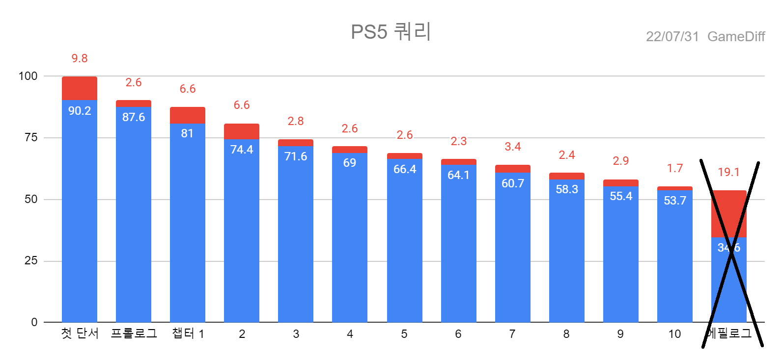 사실 이게 다른 장르의 게임이었다면 굉장히 훌륭한 수준입니다. 플레이타임 8시간 넘는 게임 중에서 50% 넘게 엔딩을 보는 게임은 드물거든요. 거기다 이탈이 튀는 구간이라고 해봐야 1, 2 챕터 정도인데 그마저도 많이 튀는 것도 아니고, 전체적으로 서서히 낮아지는 훌륭한 모습을 보여주고 있습니다. 정말 몰입도가 높은 갓겜이죠.
