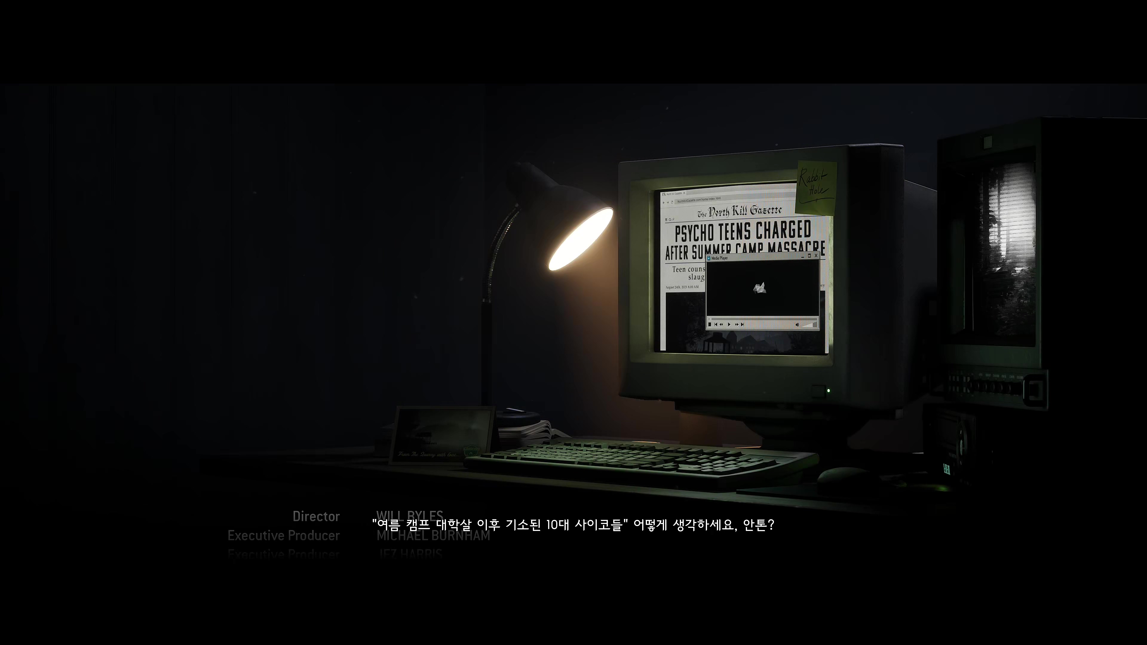 그리고 나서는 두 번째 스샷처럼 게임 내에서 팟캐스트 방송이랍시고 대화하는 장면이 나옵니다. 그냥 3명이 대화하는게 다입니다. 캐릭터가 나오는 것도 아니고, 플레이 요소가 있는 것도 아니고 그냥 대사 나오는 게 다에요. 여름 캠프 때 이러이러한 일이 있었다고 합니다. 어떻게 된 일일까요? 이런 이야기를 하는 거죠. 그리고 잘 안보일 수도 있는데, 뒤에 스탭롤이 올라가고 있습니다.