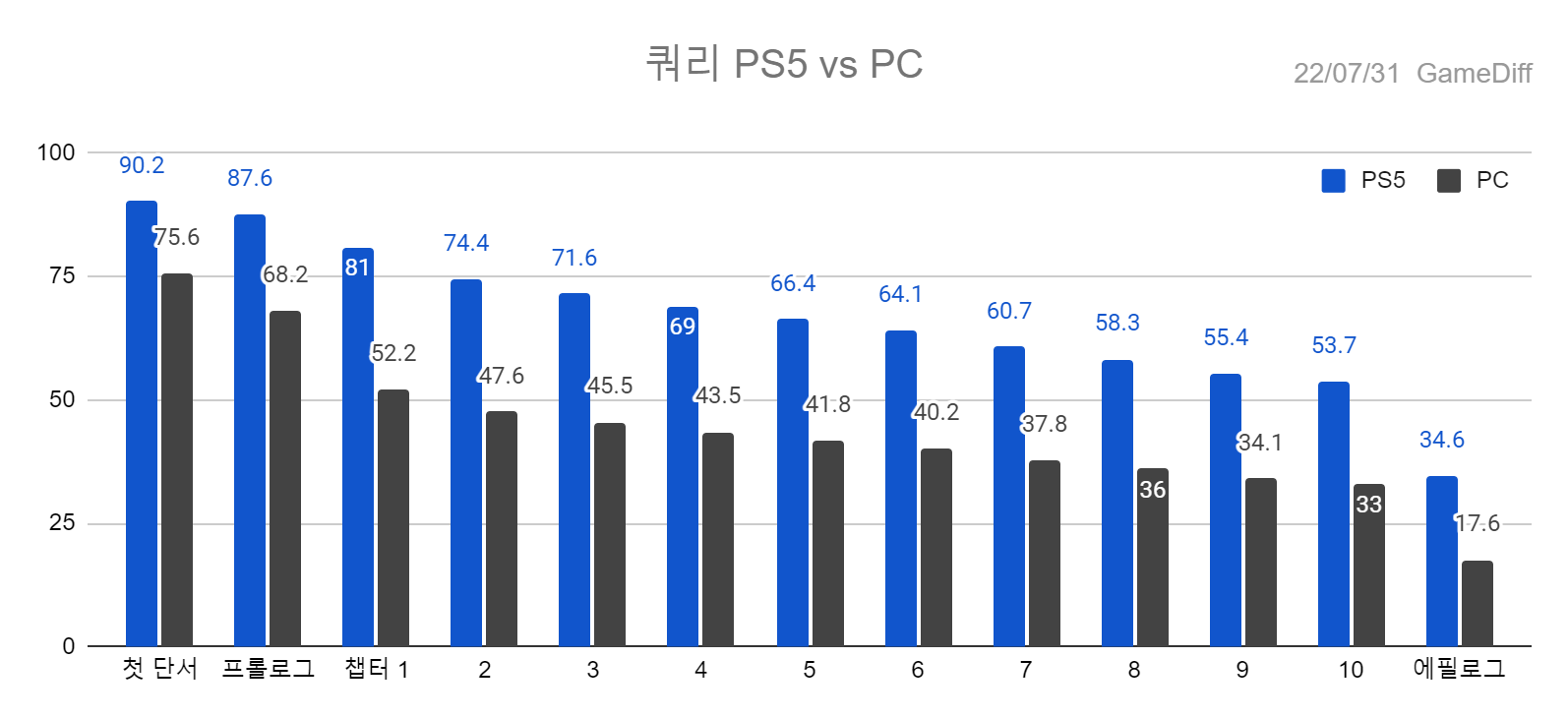 이래저래 굉장히 낮아보이지만, 피씨의 챕터 1의 클리어율을 PS5의 81%로 보정해서 본다면 피씨의 엔딩 비율(챕터 10)은 51% 정도로 서로 비슷하게 나옵니다.