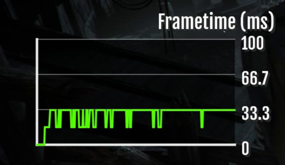 30프레임 제한이 걸린 게임이라 30프레임 나오려면 프레임 타임은 33.3ms 만 나와야 하는데 그것보다 낮게 나오는 건 측정이 잘못 되었다는 거죠. 마찬가지로 노란색 그래프도 잘못 측정되었습니다.