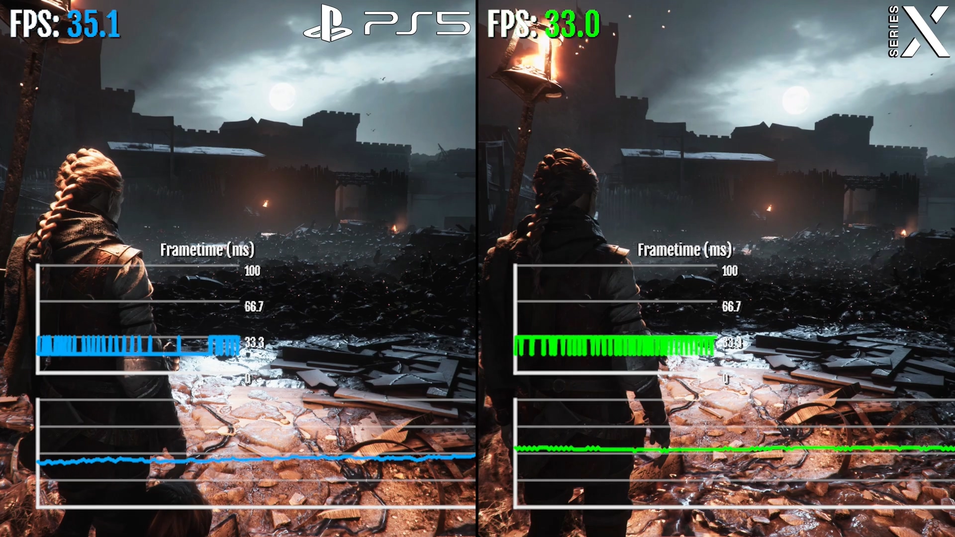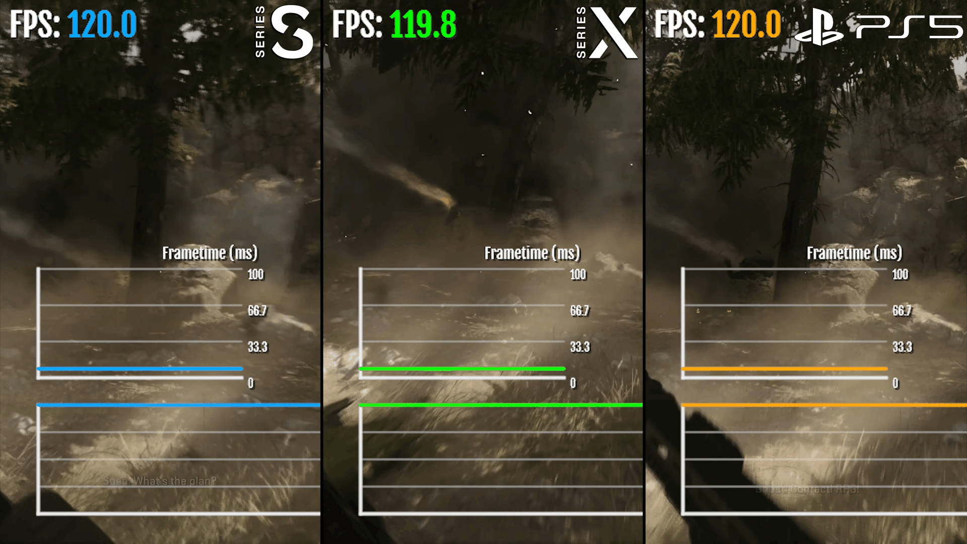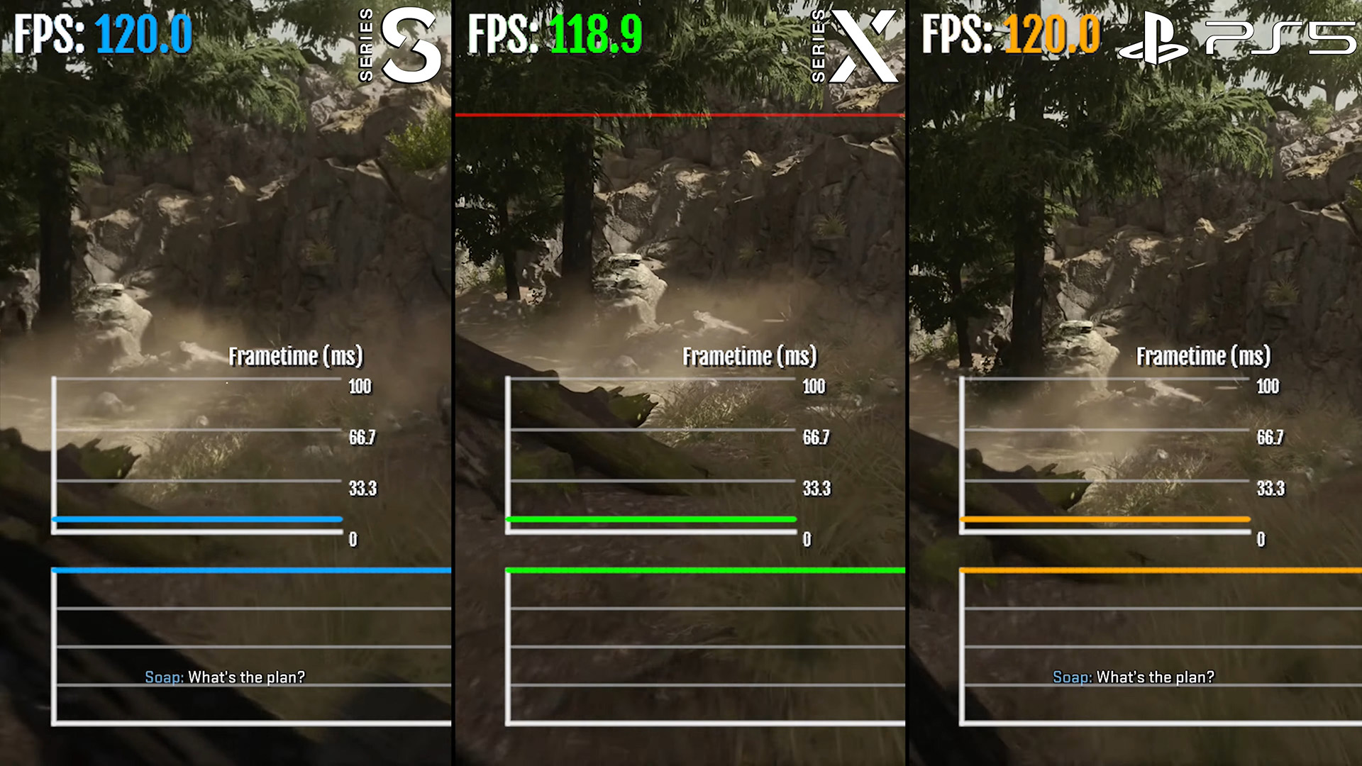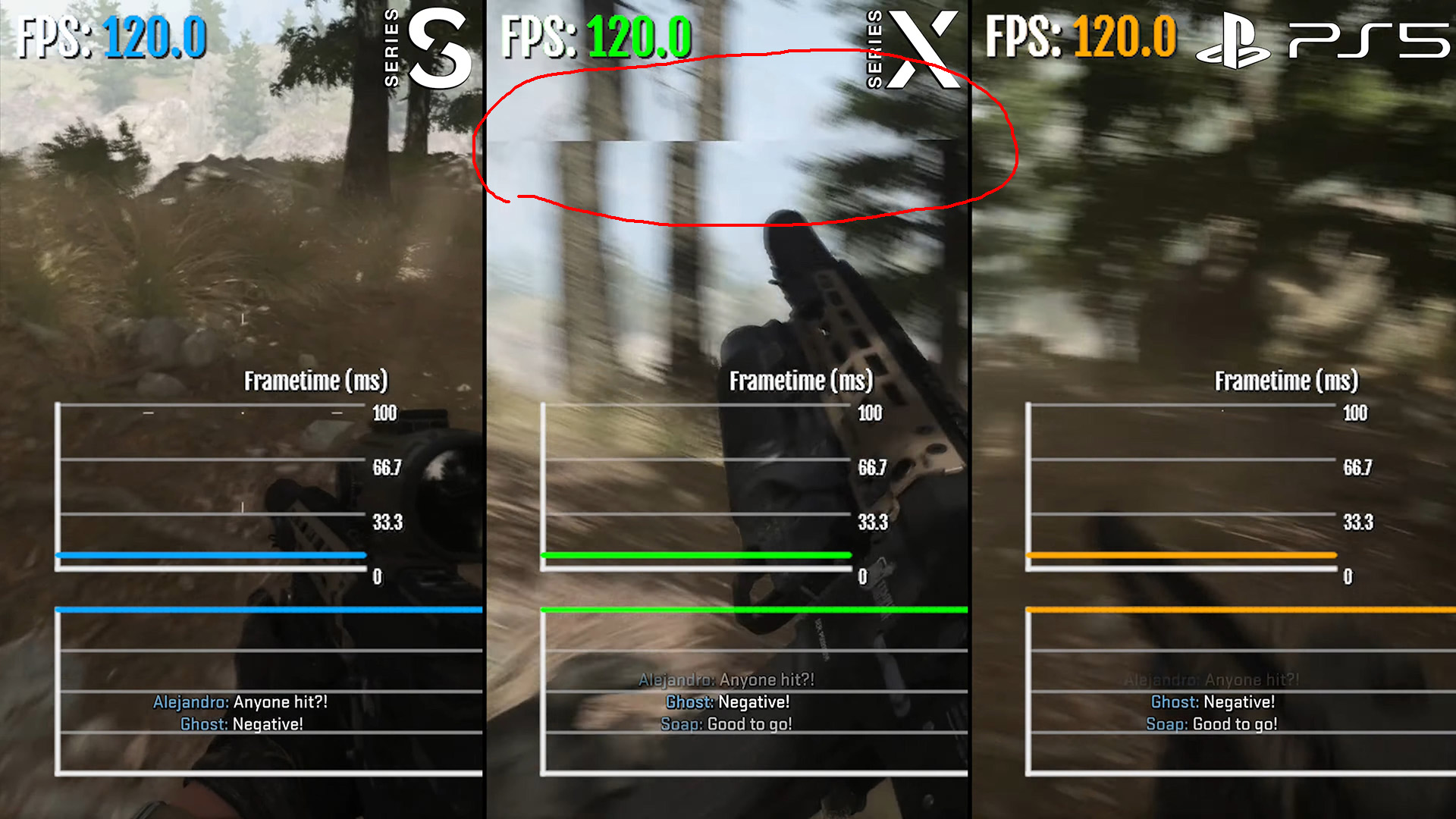 그 외에 또 이상한 점은 보시면 플스 쪽은 멈춰 있는데 엑박 쪽은 움직임이 있는 구간이 있습니다. 눈으로 봤을 때는 플스 쪽이 멈춰있기 때문에 프레임 타임이 튀면서 프레임이 드랍되어야 합니다. 하지만 플스 프레임 수치에는 변화가 없습니다.