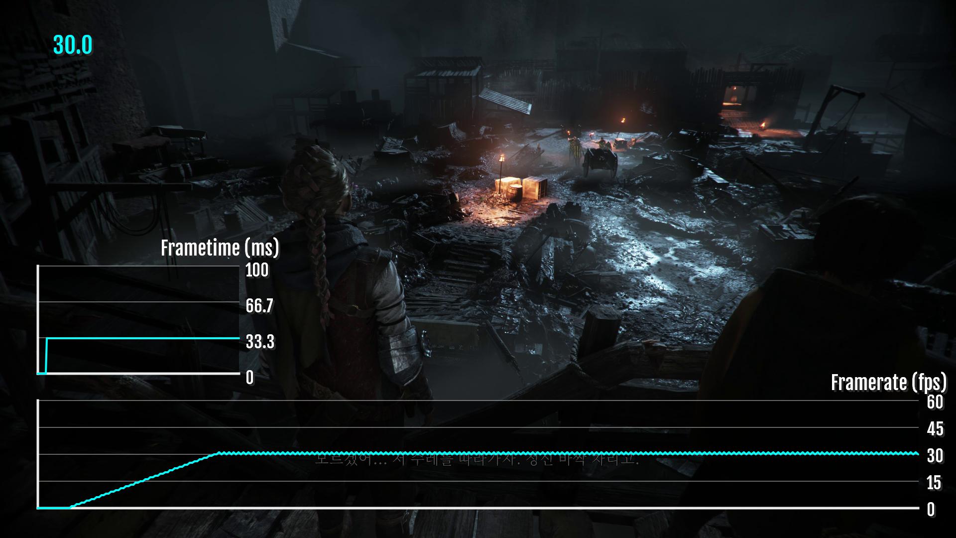 위 스샷에서 첫번째 측정 화면은 프레임 타임이 33.3보다 밑으로 떨어지는 순간이 있습니다.
