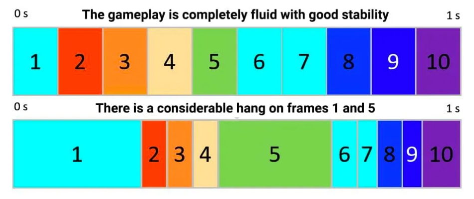 위의 1초와 아래의 1초 모두 프레임은 10개 들어갔기 때문에 둘 다 10 fps입니다. 하지만 아래쪽 1번 프레임과 5번 프레임은 표시된 시간이 다른 프레임이 비해 엄청 길었습니다. 그런데도 둘 다 10fps입니다. 하지만 아래는 1번과 5번 프레임 순간에 프레임 타임이 엄청 길었기 때문에 저 순간은 짧게나마 멈춘 듯이 느껴졌을 것이고 나머지는 프레임 타임이 짧기 때문에 너무 빠르게 지나간 것처럼 느껴질 것입니다.