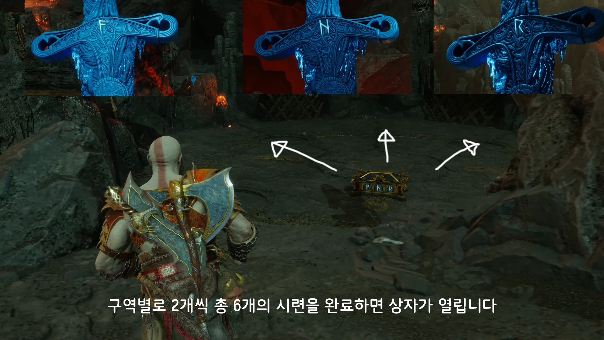 원형 공간에서 왼쪽, 중간, 오른쪽으로 가면(노르니르 상자보다 높은 곳입니다) 검 같은게 있습니다. 검에 다가가면 "시련"을 시작할 수 있는데 각 검 별로 2개씩 총 6개를 다 하시면 상자가 열립니다.