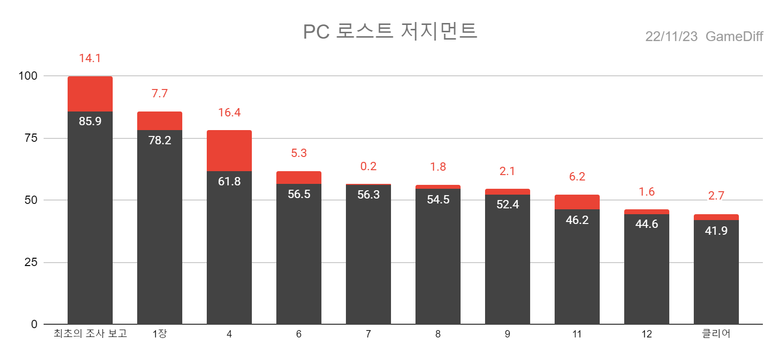 *차트의 파랑은 클리어, 빨강은 이전 단계와 비교했을 때의 이탈률을 의미합니다.