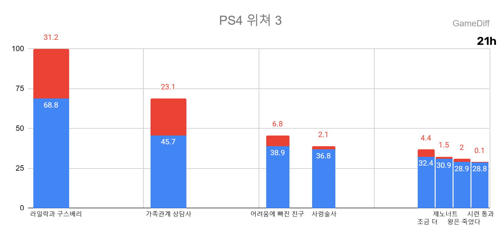여기서도 꽤나 많은 사람들이 이탈합니다. 레데리2에서도 했던 얘기지만, 여기서의 이탈을 부정적으로 보자면 재미없어서 그만 둔 사람들이 저 정도다 라고 할 수 있지만, 긍정적으로 보자면 메인 안 하고 딴거만 해도 재밌어서 저기를 넘지 않는 거다 뭐 이렇게 볼 수도 있습니다. 위쳐도 메인 없이 할 거리가 풍부한 게임이니 말이죠. 물론 긍정적으로 보는 해석은 쉴드에 가까운 주관적 해석일 수 밖에 없어서 부정적으로 보는게 맞다고 하면 할 말이 없긴 합니다.