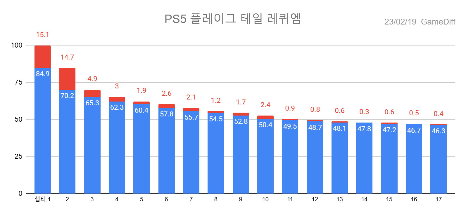 전작은 30%가 이탈하는 순간이 챕터 6쯤인데, PS5 레퀴엠은 챕터 2에서 벌써 30%가 이탈했습니다. PC 가 조금 더 늦긴 하지만 그래도 챕터 3이라서 큰차이는 없는 수준입니다.