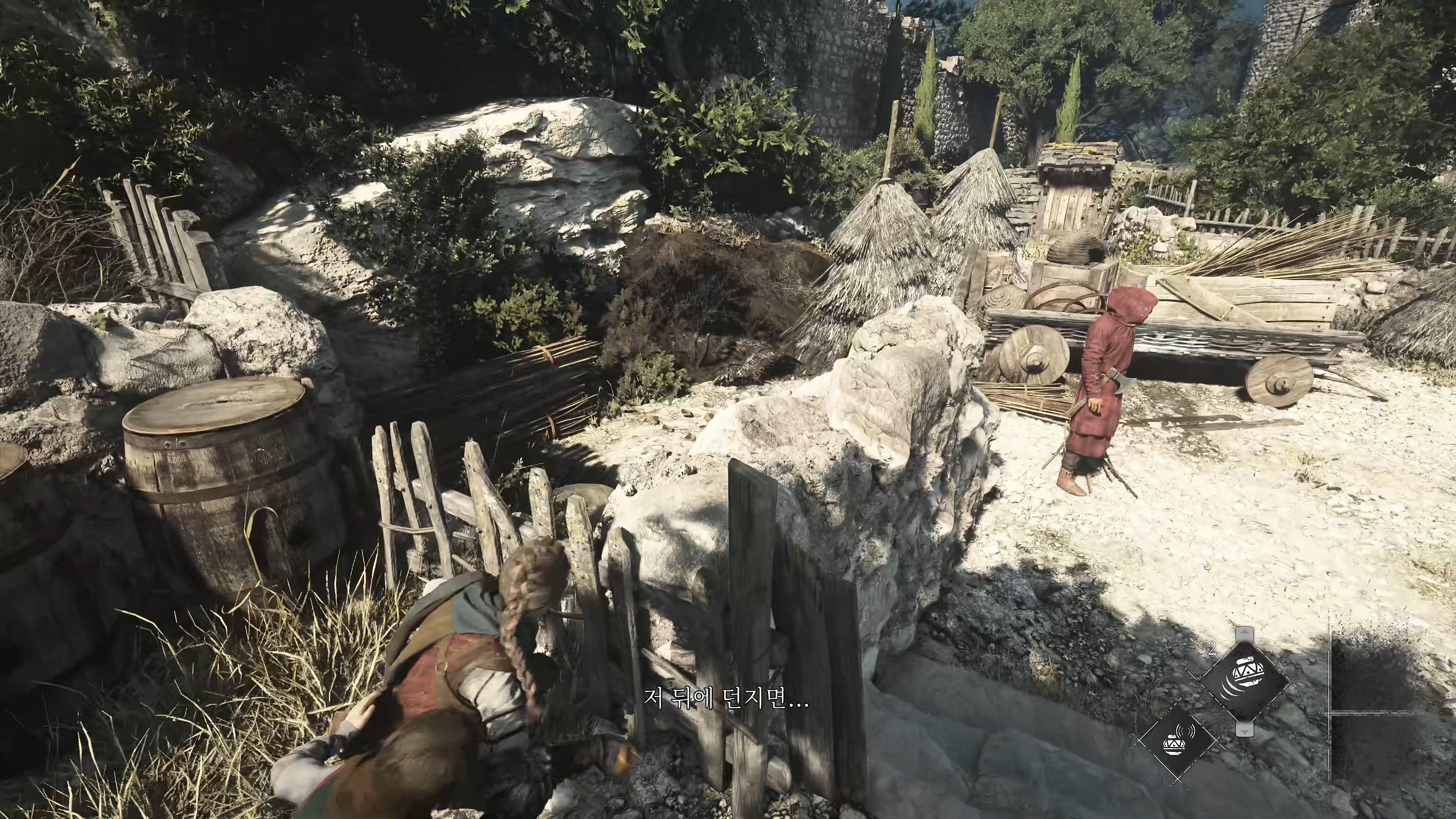 여기서 저 적의 시선을 돌리고 저기 마차 밑으로 들어가면 되는데, 마차 밑으로 들어가면 된다는 걸 알아차리기가 쉽지는 않아 보입니다.