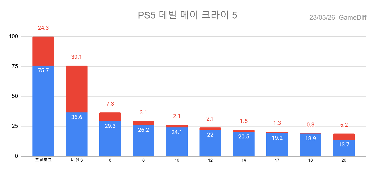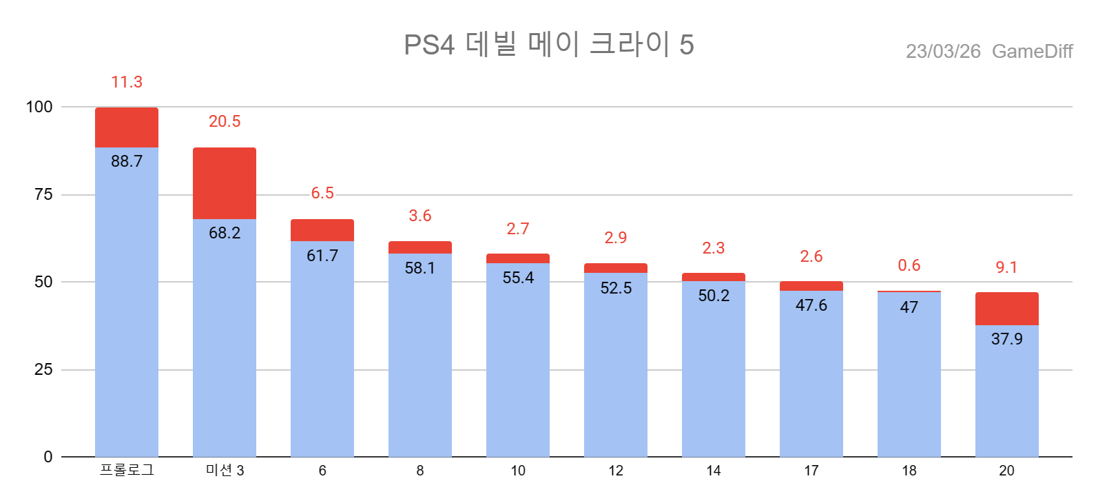 *차트의 파랑은 클리어, 빨강은 이전 단계와 비교했을 때의 이탈률을 의미합니다.