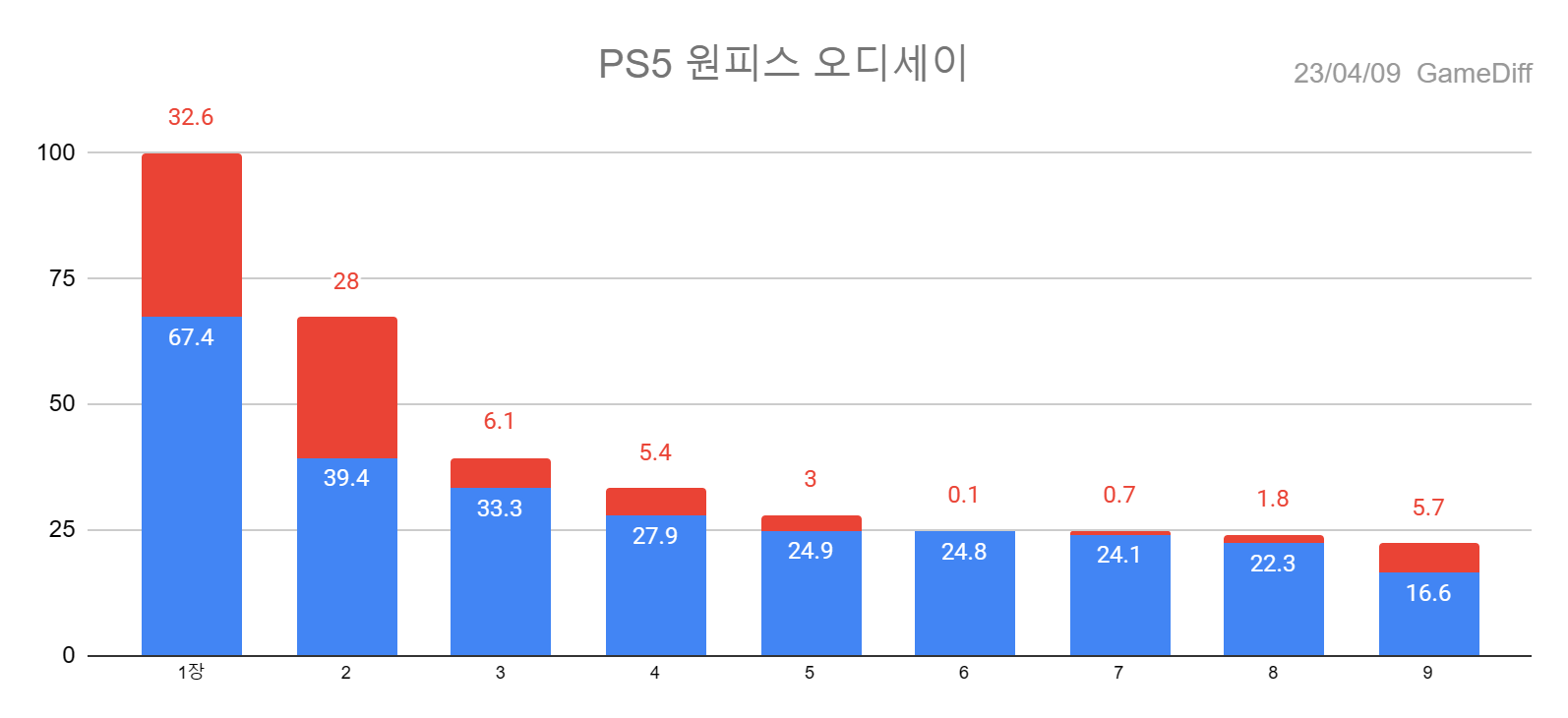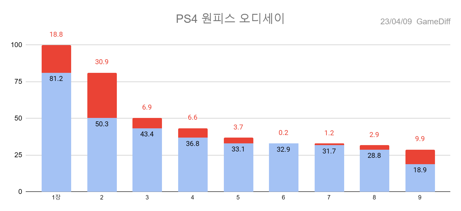*차트의 파랑은 클리어, 빨강은 이전 단계와 비교했을 때의 이탈률을 의미합니다.