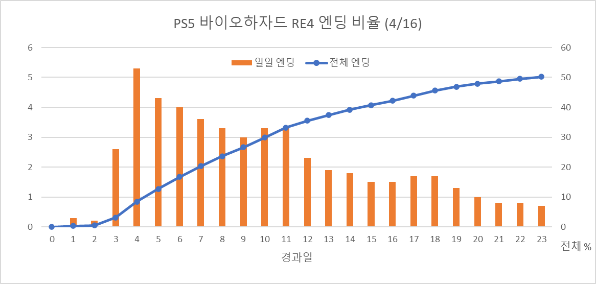 출시한 지 한 달도 안 된 게임이지만, PS5 기준으로 벌써 50%가 넘게 엔딩을 봤길래 흥미로워서 엔딩만 잠깐 살펴보고자 합니다. 아직까지 플레이하는 사람들이 많을테니 나머지는 좀 더 시간이 지난 후에 살펴 보겠습니다. 참고로 PC 버전은 벌써 58%가 엔딩을 봤습니다. 하지만 아쉽게도 얘는 일간 자료가 없어서 상세하게 살펴보진 못 하겠네요.