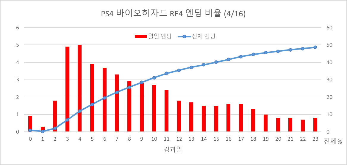 좀 눈에 띄는 건 출시 0일차, 그러니까 한국 시간 기준으로 출시하고 몇 분 안 된 시점에도 엔딩을 본 사람들이 있었다는 점입니다. 아마도 리뷰나 테스트 클리어 현황인 것 같습니다. PS5 리뷰 코드를 안 뿌렸을 것 같지는 않은데, 그냥 트로피 기록만 PS4용으로 된 건지 궁금하네요.