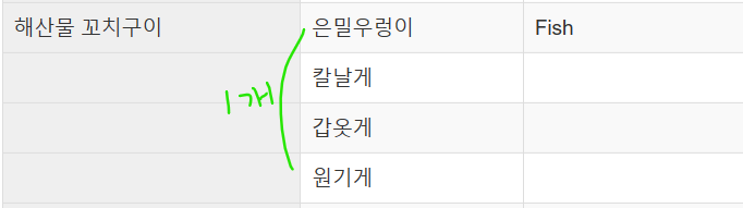 | 생선 꼬치구이 곱빼기 | Fish | Fish | Fish | Fish |