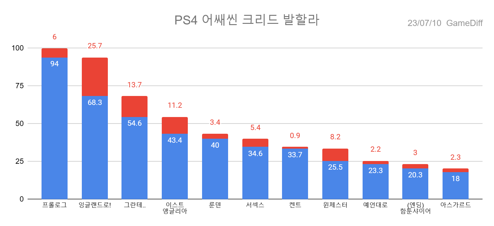 어크 시리즈는 기본 천만 단위로 파는 게임이고, 발할라는 작년 10월 기준으로 2천만 플레이어를 달성하기도 했습니다. 판매량만 치면 1000만은 충분히 넘었을 것 같습니다. 이 정도 규모의 게임에서 초반 2~3시간에 이 정도 이탈은 앞서 얘기한 파판 7 리메 외에도 종종 있는 편입니다. 바하 시리즈나 스토리 중심의 게임 정도가 예외적으로 이탈이 낮은 편일 거 같네요.
