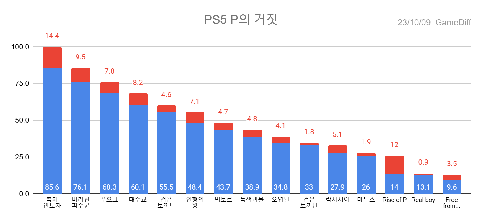 | [스팀 동접] P의 거짓과 스타필드 - 발매 후 동접 변화 (출시 2주 vs 출시 1달) (1) | 2023.10.03 |