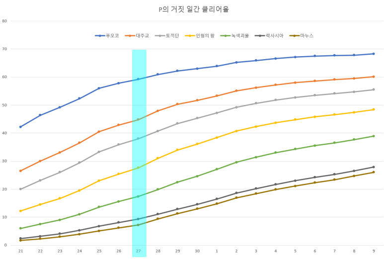 초반 보스들은 이제 클리어율 변화가 크지 않지만 후반부 보스들은 아직 일간 클리어율 변화가 1% 넘게 일어나고 있기 때문에 클리어율은 느리지만 그래도 한동안은 계속 상승할 것 같습니다.