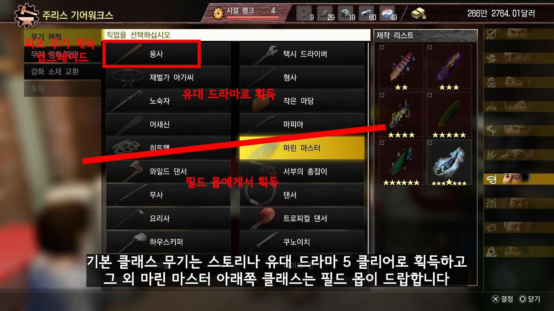 그 외에 각 캐릭터들의 기본 클래스인 택시 드라이버 ~ 히트맨 클래스의 7성 무기 제작용 5성 무기는 유대 레벨을 올려야 획득할 수 있습니다.