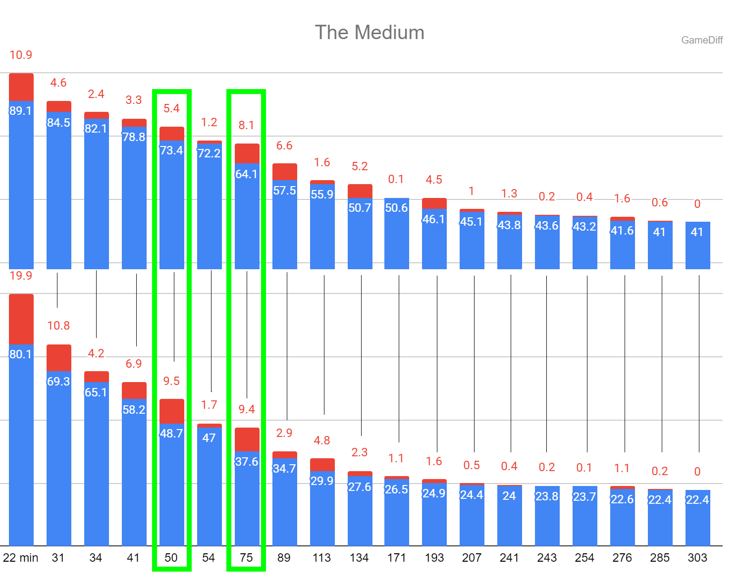 *차트의 가로축은 참고 영상에서 스토리에 필수적인 업적이 완료되는 시점의 시간을 의미합니다. 평균 플레이 시간이 8시간인데 비해서 참고 영상은 5시간 짜리이기 때문에 대충 게임 내에서 어느 정도 지점이다 정도로만 참고해 주세요.