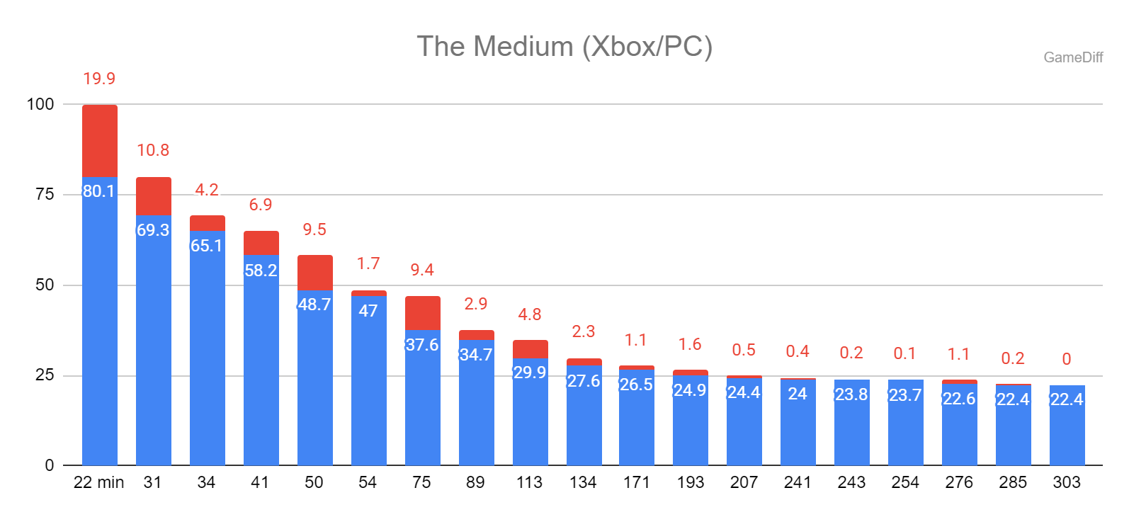 스토리 중심의 게임 치고는 PS5 버전에서도 많이 이탈하고, 게임패스 버전은 어마어마하게 이탈합니다. 세부 내용을 살펴보면 성능 문제, 불명확한 목표 안내, 까다로운 퍼즐 등으로 많은 유저들이 이탈한 것으로 보입니다. 거기다 초반에는 스토리가 없다시피 한 것도 직접적인 요인까지는 아니지만 간접적으로 영향을 끼쳤다는 생각이 들구요.