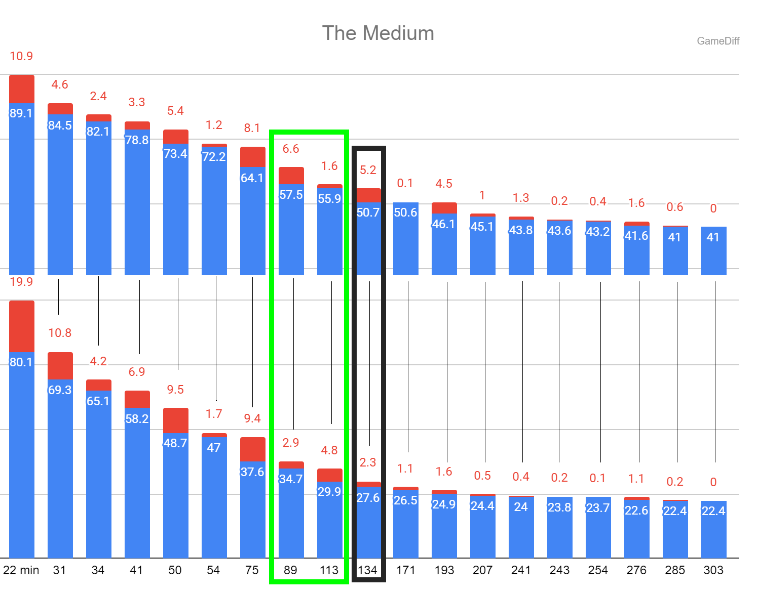 양 기종 간 차이 외에 차트의 플레이 경향만 살펴보면 눈에 띄는 부분은 역시 초반의 이탈입니다. 22분 전에 이탈은 아예 처음부터 접은 사람이라 쳐도 22~31분 사이의 구간이 좀 남달라 보입니다. 10분 정도 밖에 안되는 구간, 거기다 컷씬을 빼면 5분 정도 되는 구간인데 PS5에서 4.6%, 나머지에서 10.8%가 게임을 접었습니다. 저 시간은 공략을 알고 5시간 만에 깬 사람 기준이니까, 나머지 사람들이 여기서 접었다는 건 헤맸거나 싫었거나 2가지 중 하나가 아닐까 싶습니다.