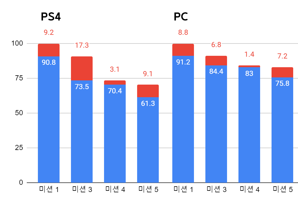 뒤이어 미션 2~3의 경우 피씨는 이탈률이 그렇게 높지 않은데 PS4는 이탈률이 상당히 높습니다. PS4는 17.3%로 PC와 10% 넘게 차이납니다.