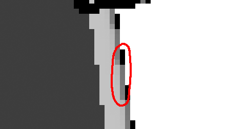 대각선을 확대해보면 이 대각선을 구성하는 작은 계단들을 볼 수 있습니다. 저 작은 계단 하나하나가 게임의 해상도 상에서는 1픽셀입니다. (위의 스크린샷에서는 가로로 1픽셀입니다.) 게임 해상도가 티비 해상도와 동일하다면 게임의 1픽셀은 티비, 그러니까 스크린샷의 1픽셀과 동일합니다. 하지만 게임 해상도와 티비 해상도가 다를 경우 게임 화면을 티비에 맞게 늘리거나 줄여서 표시해주게 됩니다.