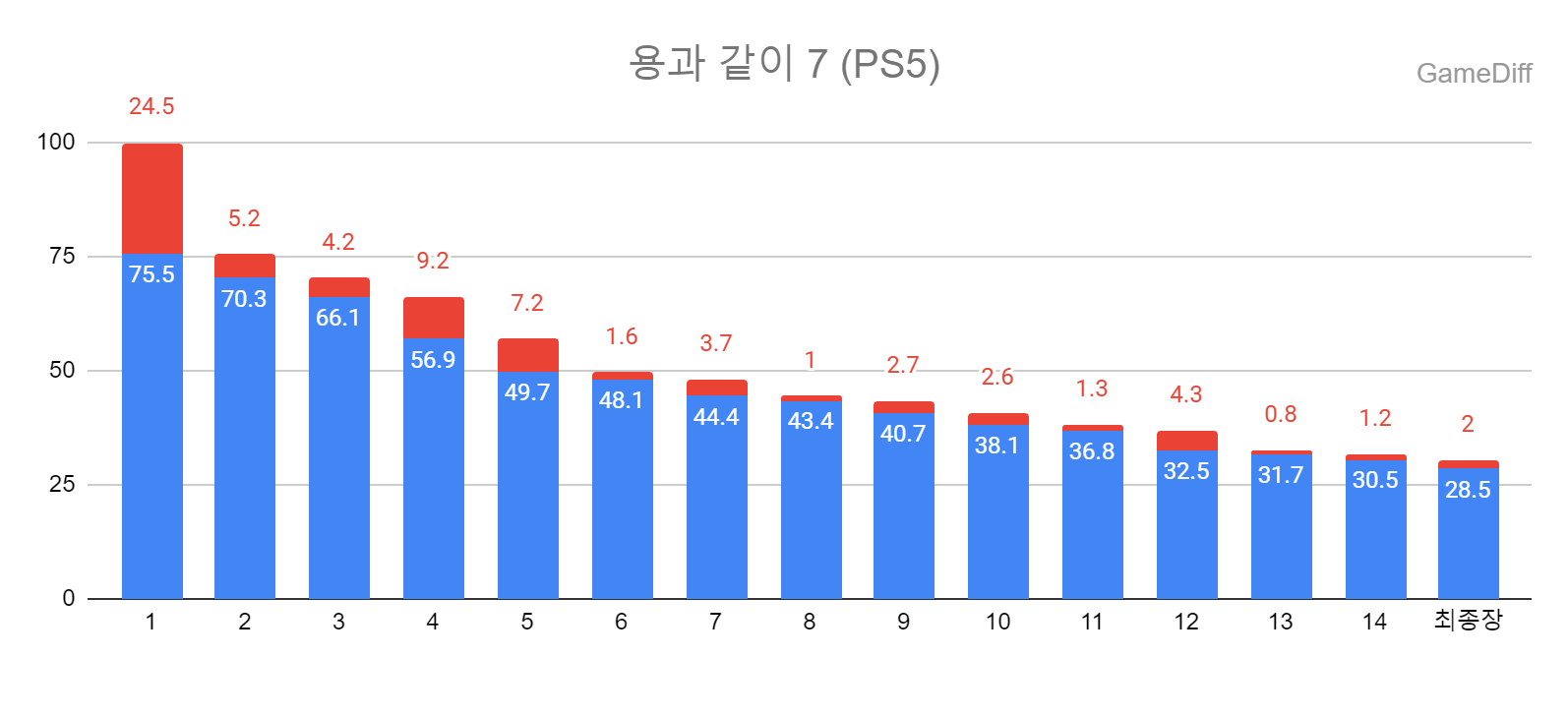 PS5 버전은 PS4 버전과 다른 결과를 보여주고 있습니다. 초반부의 이탈이 상당히 높습니다. 초반에 잠깐 하고 접은 사람이 저렇게나 많습니다.