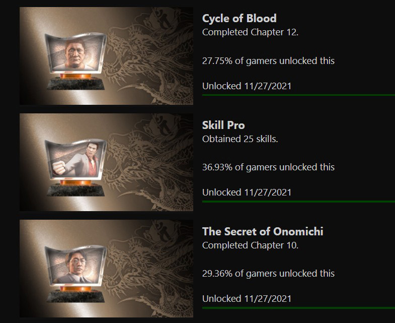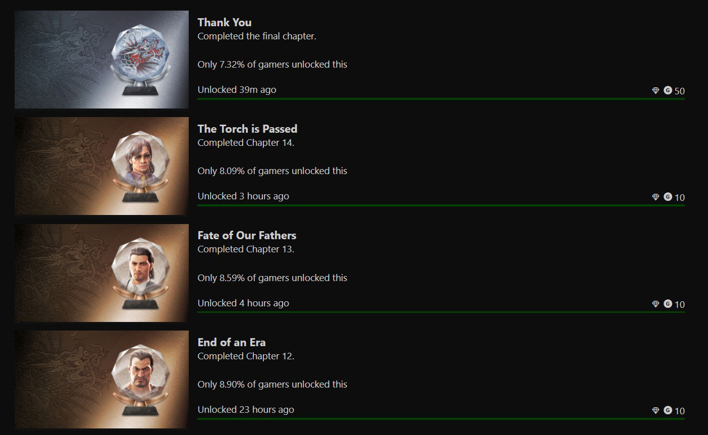 *위의 용과 같이 6 xbox 업적 스샷에서, 챕터 12완료 후에 엔딩 업적까지 스샷에 있어야 하는데, 크레딧을 다 보고 영상을 봐야 엔딩 업적이 완료되는데 그걸 빼먹어서 스샷에는 없습니다. 그래도 아래 차트에는 엔딩 업적 들어가 있습니다.