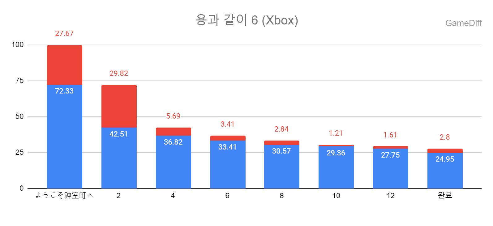 용과 같이 7의 Xbox 엔딩 비율은 PS에 비해 매우 낮습니다. 그 이유는 뻔하지만 게임패스 무료 게임 + Xbox의 대부분을 차지하는 서양권 유저 취향이 아니기 때문으로 보입니다. 물론 그걸 감안해도 수치는 상당히 낮긴 하지만요.