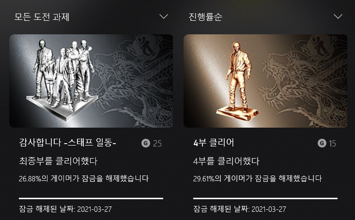 용과 같이 5도 엔딩 비율이 26.89%로 비슷합니다. 4는 엔딩 비율이 55%나 나오는데.. 뭔가 이상하니 일단 4는 빼고 생각하겠습니다.