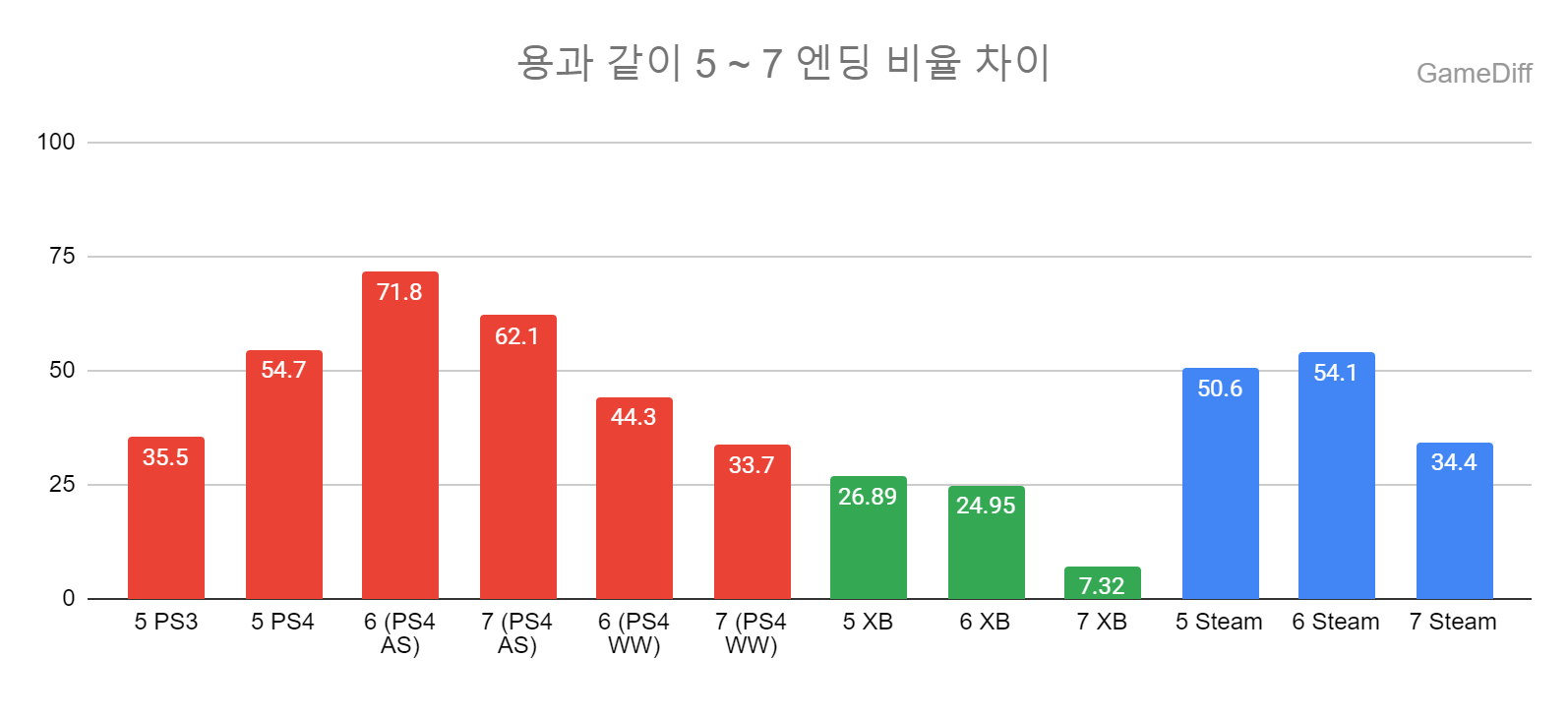 플랫폼별로 살펴봤을 때 전부 6보다 7의 엔딩 비율이 떨어졌습니다. 그 와중에도 플스 쪽이 선방을 했네요. 스팀도 많이 떨어지긴 했지만 엑박은 처참하군요.