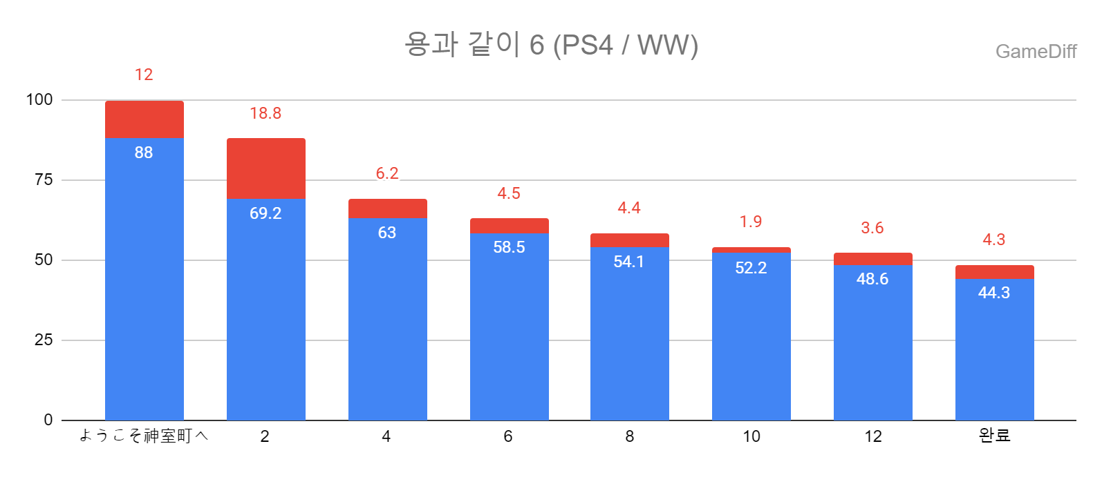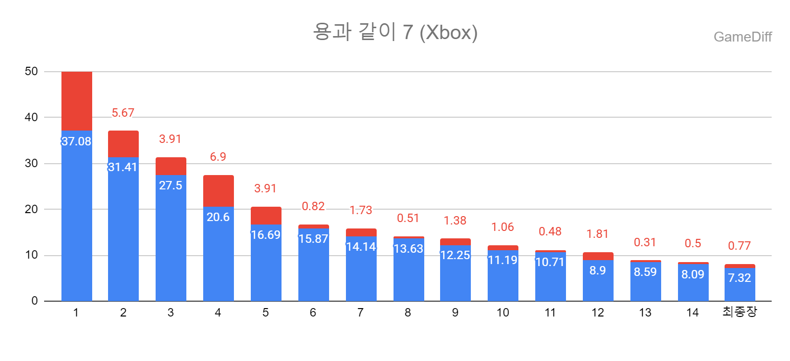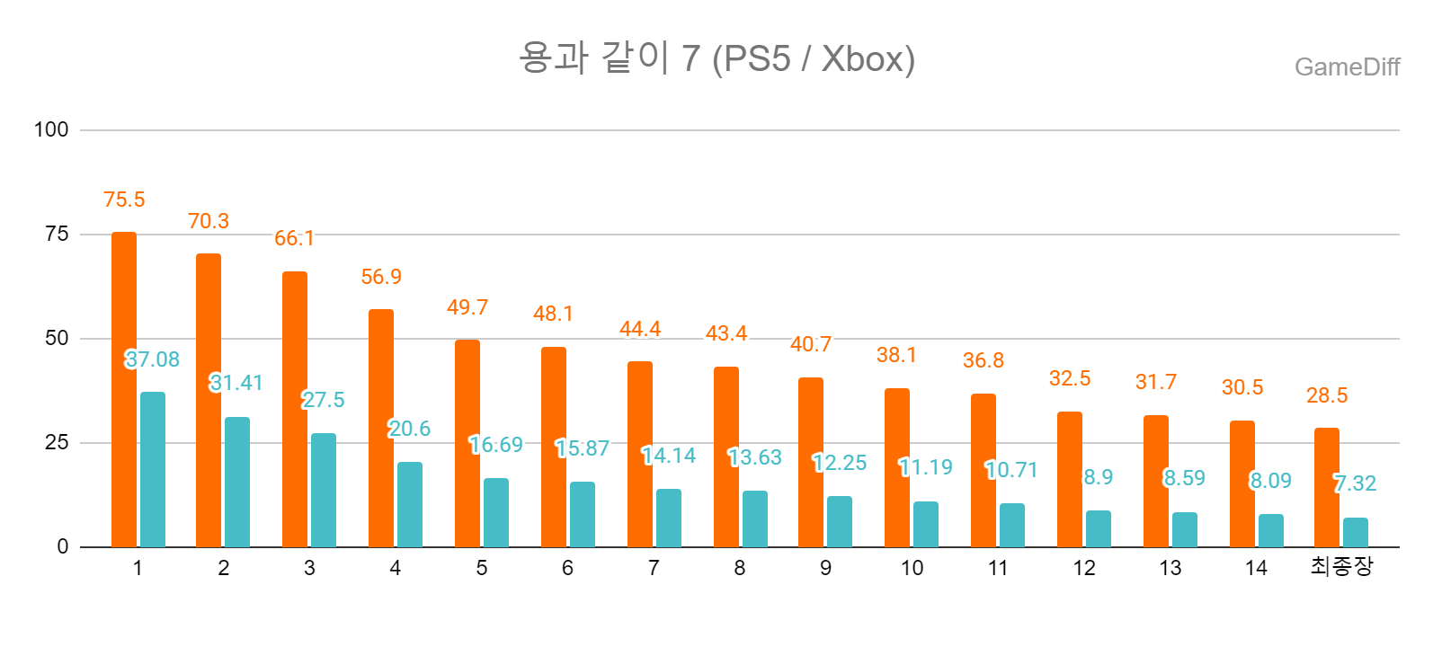 7에서 새롭게 도입된 턴제 전투에 대한 거부감이라고 하기엔 이전 용7 글에서 얘기했듯이 초반부의 이탈이 6보다 더 적기 때문에 그 때문은 아닐 거라는 게 제 생각입니다. 이건 플스 뿐만 아니라 스팀에서도 마찬가지이기도 합니다. 플스나 스팀과 다르게 엑스박스의 초반 이탈이 어마어마하긴 하지만, 무료 게임이기 때문에 이걸 가지고 턴제 전투에 대한 거부감이라고 해석하기는 무리가 있습니다. 그래서 플스와 스팀에 공통적으로 나타나는 전작보다 더 적은 초반 이탈, 이라는 현상을 가지고 턴제 전투에 대한 거부감은 높지 않다라고 해석하는게 더 맞다고 생각합니다.