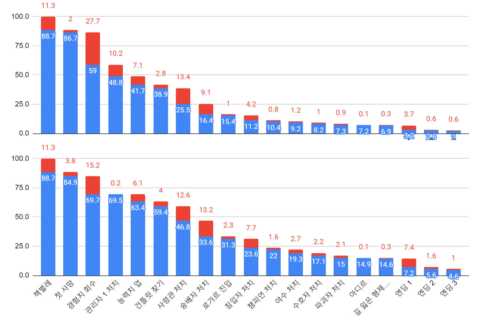 저기 <능력치 업> 부분이 첫 보스를 잡고 나서 바로 이어지는 부분인데, 저것도 하지않고 이탈한 사람들이 6~7% 정도 됩니다. 보스는 잡았는데 못 해먹겠다 생각한 사람들이 저 정도 된다는 거죠.