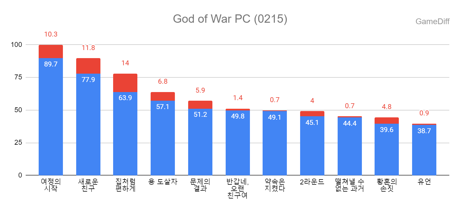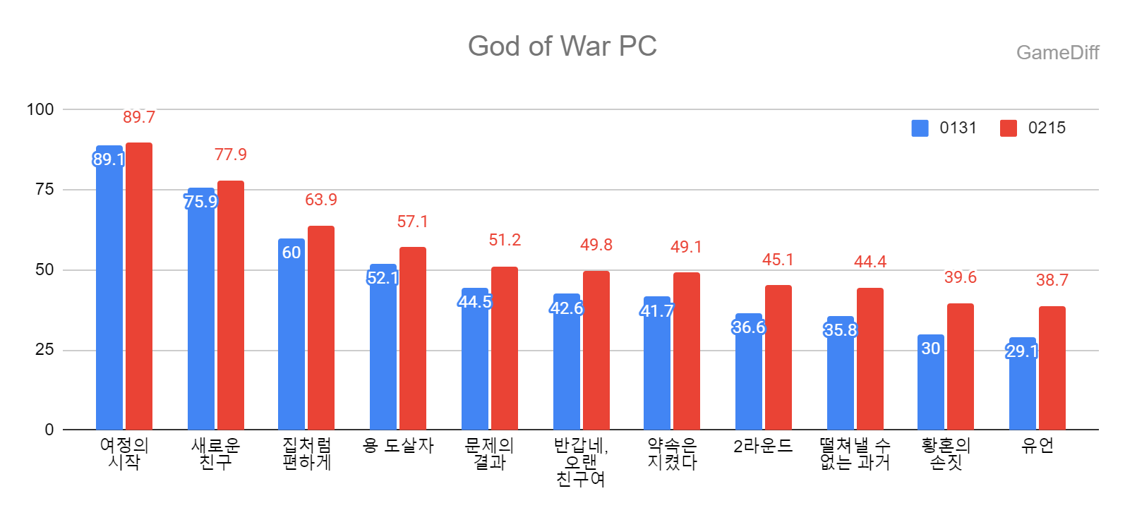 일단 출시 2주만에 엔딩을 본 사람들이 30%나 됩니다. 플레이타임이 20시간 정도 되는데도 많이들 깼네요. 출시하고 얼마 안 됐을 때를 살펴본 게 이번이 처음이라서 이게 일반적인 건지, 아니면 갓 오브 워라서 그런 건지는 잘 모르겠습니다. 다른 게임들은 어떤지 궁금해 지네요.