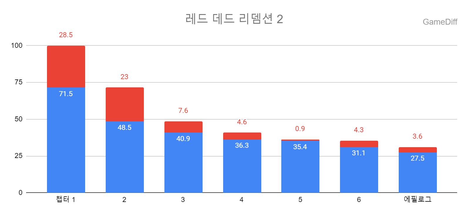 오픈 월드 명작 레드 데드 리뎀션 2의 엔딩 비율을 보면 명성에 비해 낮은 수준 같아 보이지만 오픈 월드라는 특성을 고려해 보면 일반적인 수준입니다. 거기다 자유도가 다른 오픈 월드 게임에 비해서도 높기 때문에 클리어 비율이 낮은 것은 이탈이 아니라 머물러 있는 것이 아닐까 하는 생각도 들 정도입니다. 다만 초반의 이탈률이 나쁘지는 않지만 게임 퀄리티에 비해서는 아쉬운 감이 있어서 거기만 좀 더 좋았다면 하는 생각이 듭니다.