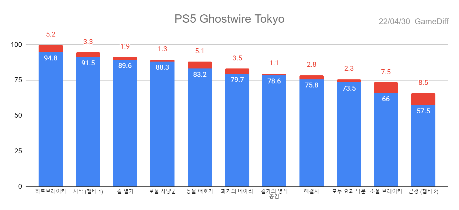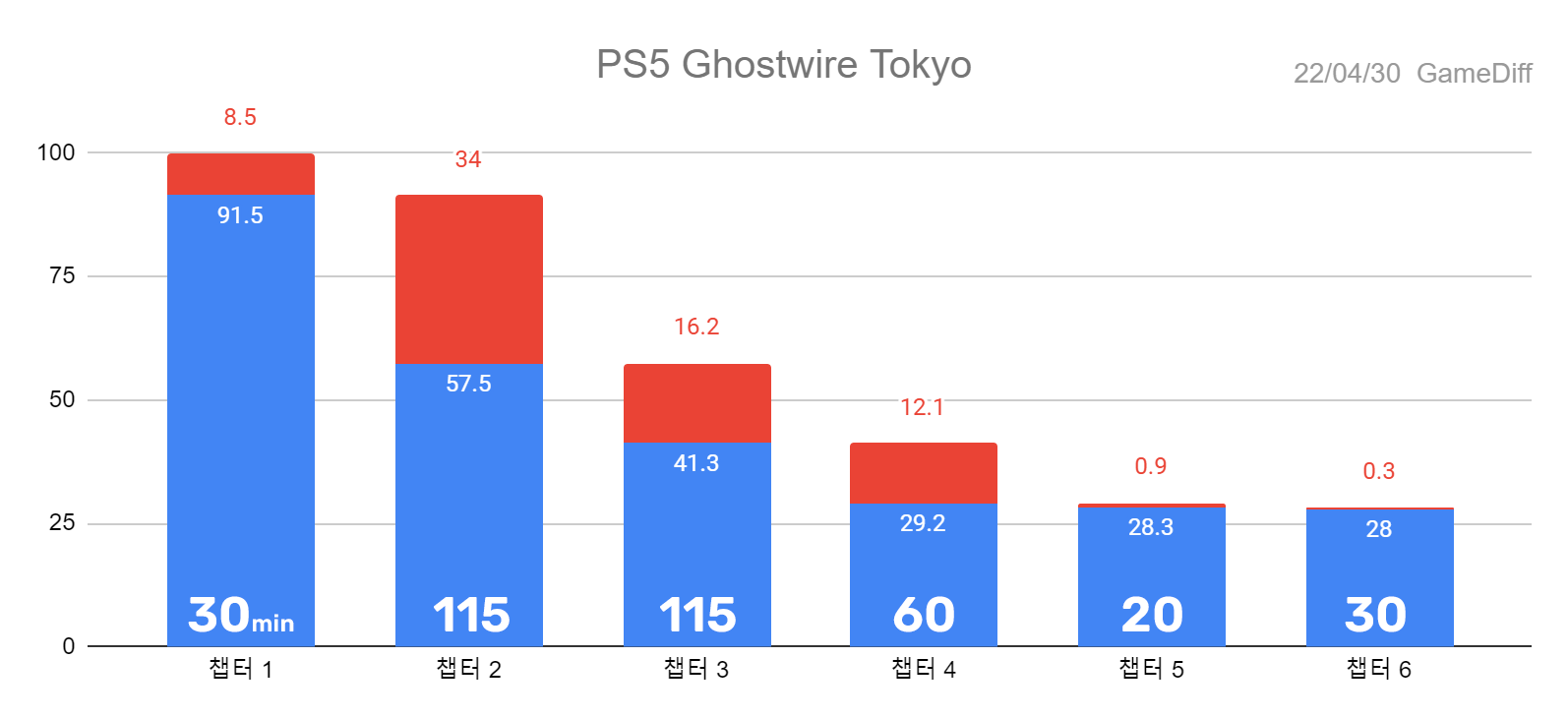 1장은 30분 밖에 안 되는 분량이기는 하지만 그래도 이탈률이 괜찮은 수준입니다. 파이널 판타지 7 리메이크가 1장 30~40분 분량에 20% 넘게 이탈했던 걸 생각해보면 훌륭하다고 해도 될 거 같네요.