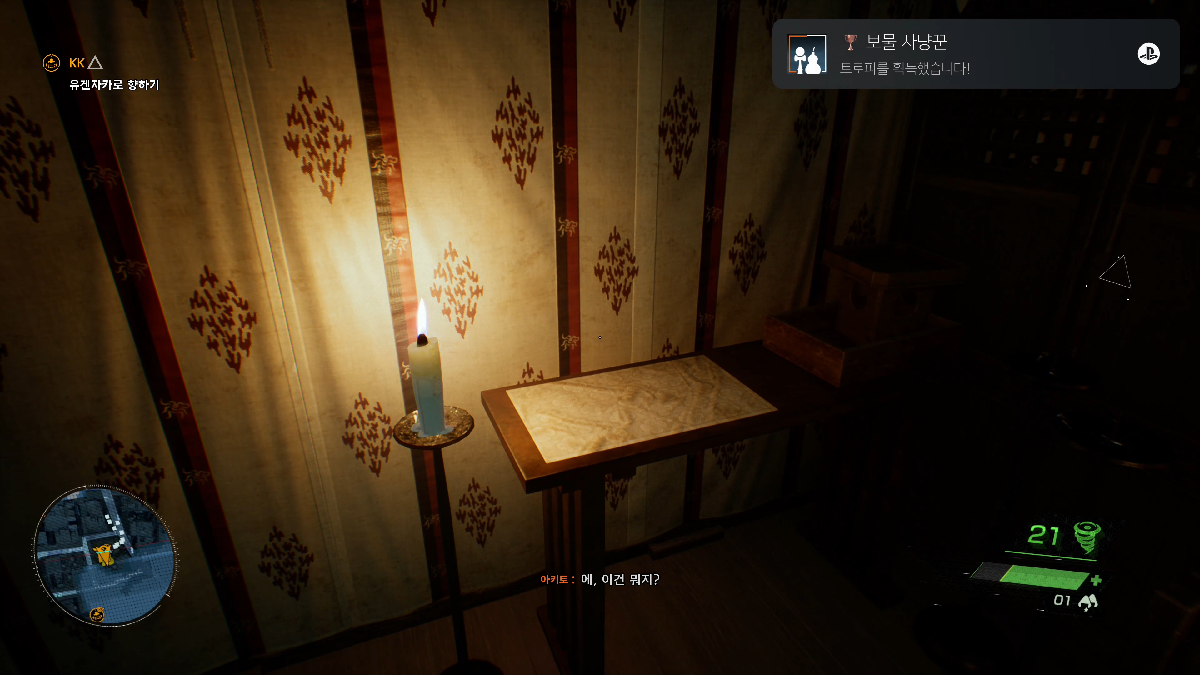 <길 열기> 업적이 도리이, 그러니까 일종의 거점을 해방하는 활동인데, <보물 사냥꾼>은 <길 열기>에 바로 이어서 달성할 수 있는 업적입니다. 이 2개 업적이 1장 완료 후에 3분 정도면 달성 가능합니다. 그래서 <보물 사냥꾼>까지는 그냥 1장이라고 보면 됩니다.