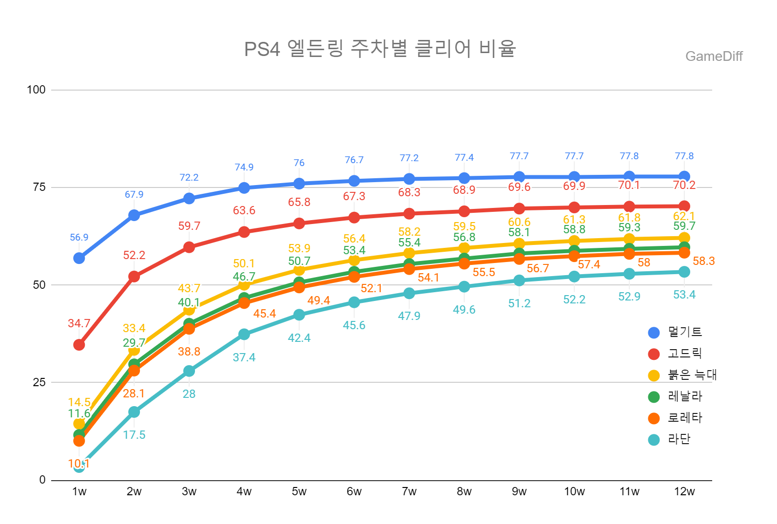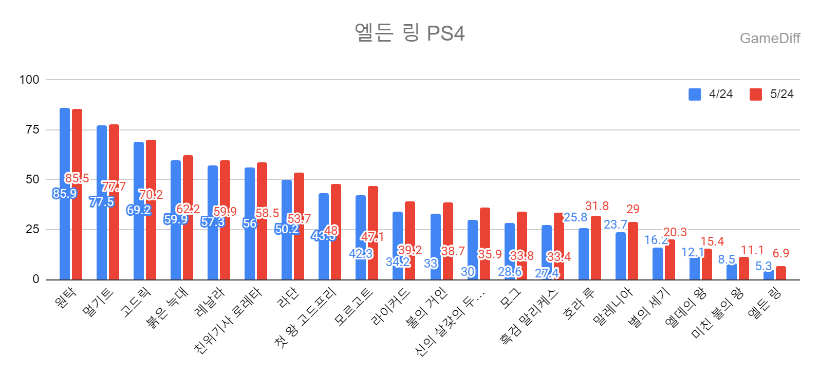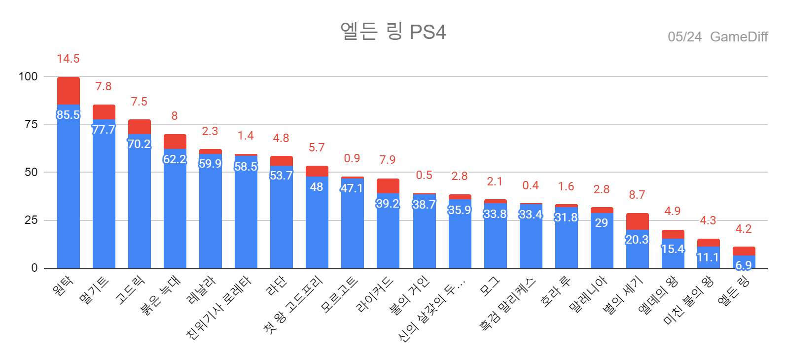 발매 한 달 후 보스 별 클리어 자료를 살펴본 적 있습니다. 위와 같은 결과가 나왔었죠. 그럼 두 달이 지난 지금은 어떨까요? 사실 엘든 링 얘기를 또 하는 건, 이제 딱히 살펴볼 만한 게임이 없어