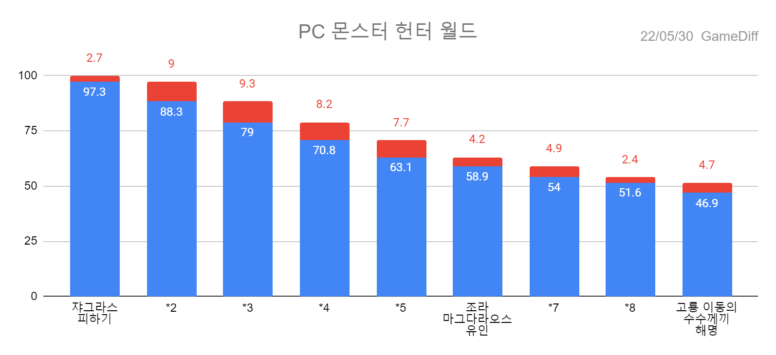 그래도 굳이 억지로 단점을 찾아보자면 후반부의 이탈률이 높아 보인다? 후반부로 가면 게임이 정말 맞는 사람들만 남아서 이탈률이 1% 이하로 나오는 경우도 많은데 몬헌 월드는 3%정도 나옵니다. 물론 플탐이 길어서 플레이 시간 대비 이탈률로 보자면 결국은 비슷한 수준이긴 하겠지만, 엔딩 비율이 이렇게 높을 정도로 몰입도가 높은 게임인데 후반 이탈은 평범한 수준이라는 게 좀 아쉽습니다. 후반부로 갈수록 노가다도 많아지고, 전투도 더 힘들어져서 저정도 밖에 이탈 안 한게 오히려 더 좋게 봐야 하는 건가 싶기도 한데.. 어차피 충성 유저들은 메인 퀘스트 아니어도 계속 할테고, 그런 것들은 더 어렵게 했어도 상관없었을테니 메인은 좀만 더 쉽게 하면 좋지 않았을까 하는 생각이 듭니다. 근데 사실.. 뭐 딱히 문제거나 단점이다라고 하기까진 어렵긴 한데 억지로 그냥 얘기해 본 겁니다.