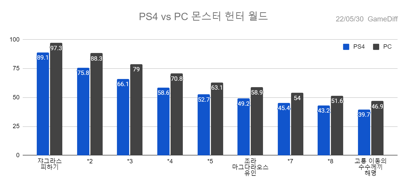 이걸 보면 몬헌의 초반 클리어율이 높은 것도 같은 맥락에서 생각해 볼 수 있지 않을까 합니다. 데이즈 곤과 달리 몬헌은 플4 버전도 이탈 거의 없이 많이들 하긴 했지만 체감 성능이 좋은 것은 아니었습니다. 특히나 프로가 아닌 노멀 플4에선 더 그랬죠.