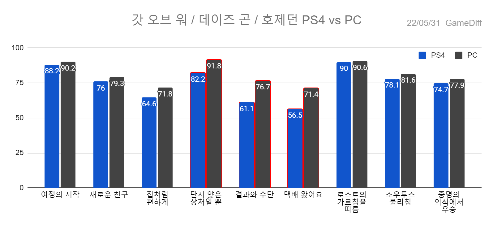 일단 다른 점이 발매일. 플4 출시 후 거의 반년 정도 후에 피씨 버전이 출시되었습니다. 피씨 버전이 늦게 출시한 경우 피씨와 플4 버전이 차이가 있는 경우도 있고 비슷한 경우도 있습니다.