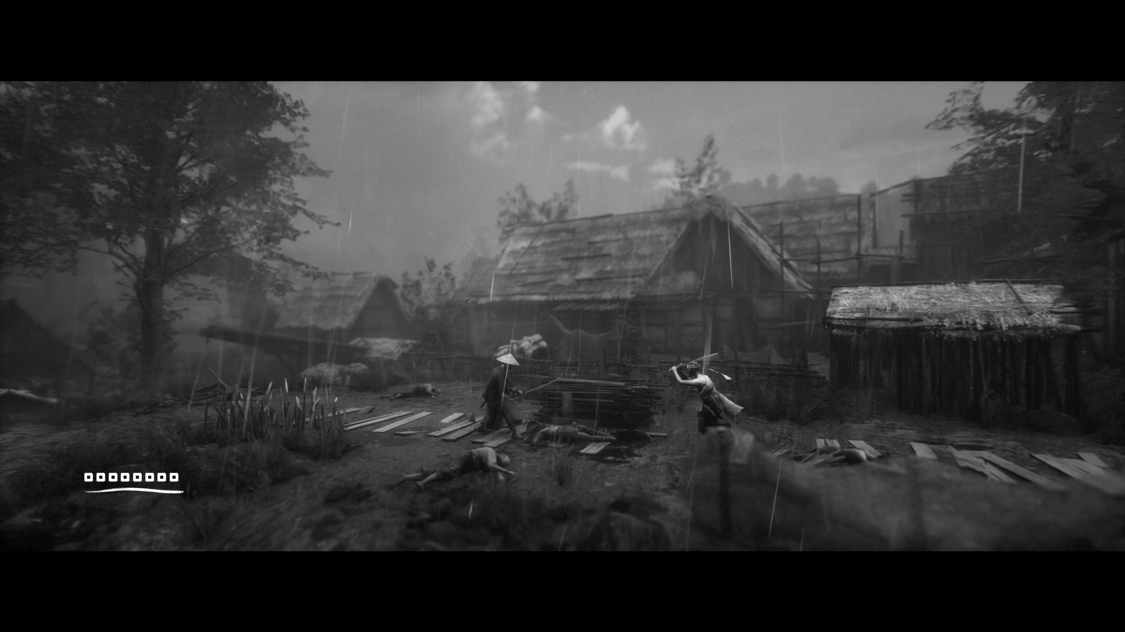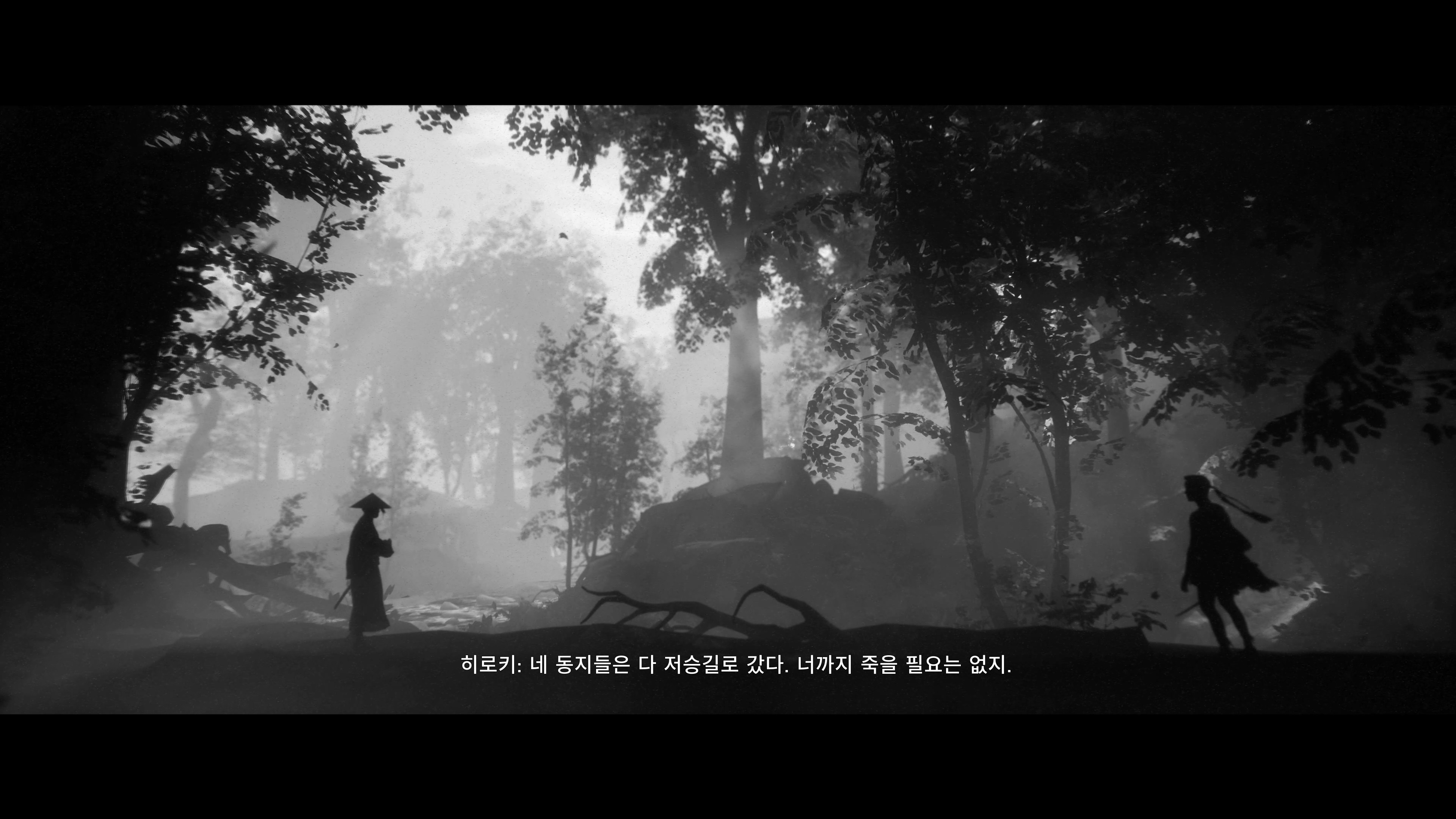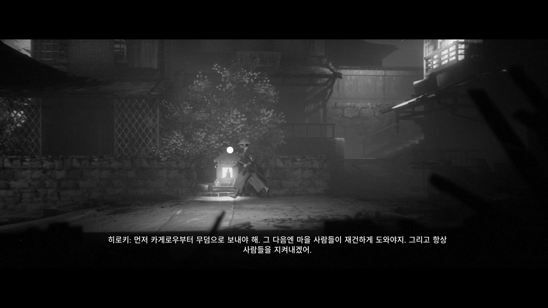 이 게임은 흑백 만으로도 낮, 흐림, 밤의 구분이 가능합니다. 고스트 오브 쓰시마도 흑백 모드가 있긴 하지만, 처음부터 흑백을 기준으로 만들지 않았기 때문에 낮과 밤의 구분도 힘들고, 어두운 장면에선 명암의 구분이 쉽지 않은 경우도 많이 있습니다. (플레이는 못 해보고 영상으로만 보긴 했지만요) 그래서 저는 전체적으로 아트가 많이 아쉬웠습니다. 하지만 이 게임은 시간대가 더 분명히 구분되고, 상황에 따라선 극단적으로 빛과 어둠을 사용하여 멋진 장면을 만들어 내기도 합니다. 단순히 흑백 필터를 입힌 수준이 아니라 처음부터 흑백을 고려하여 임팩트 있는 장면을 만들어 냈다는 얘기죠.