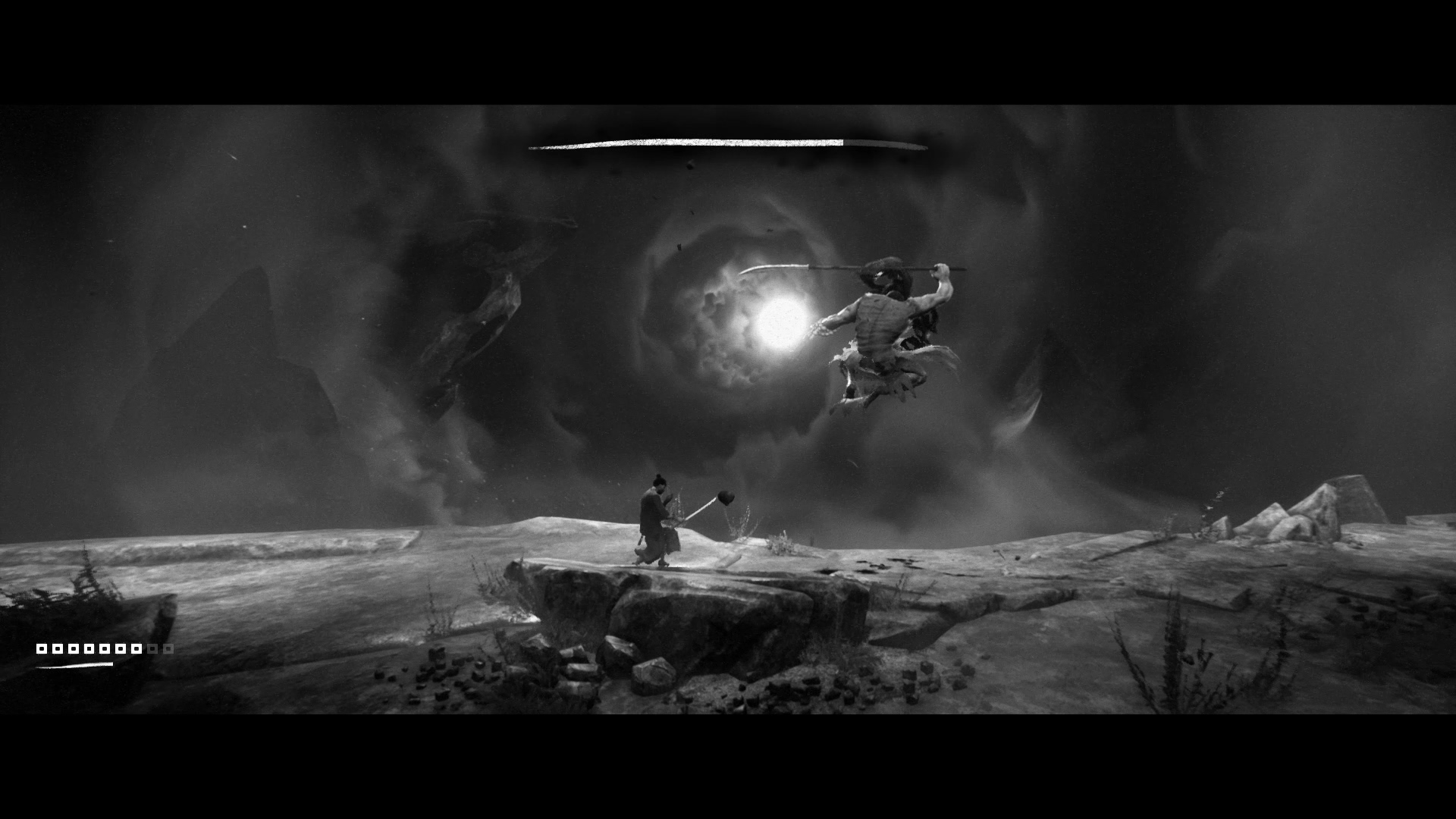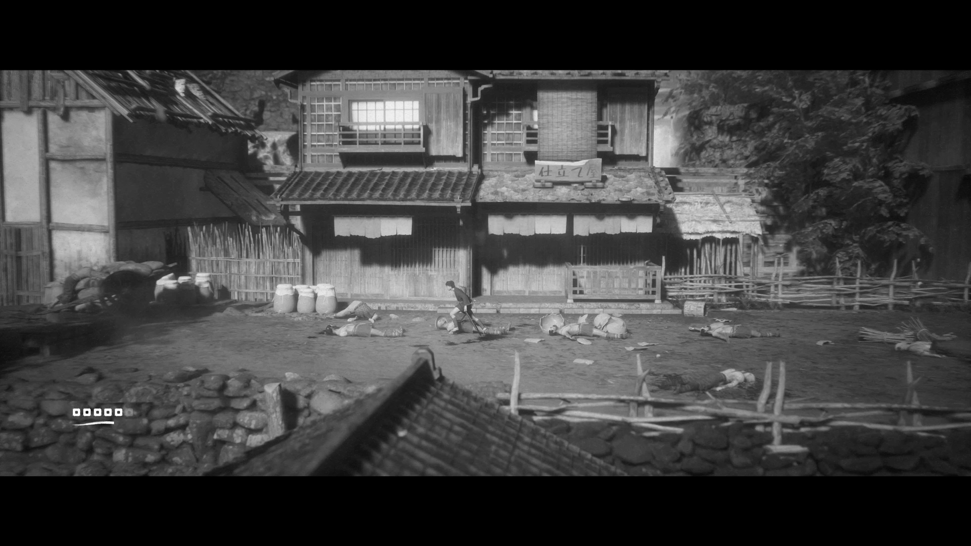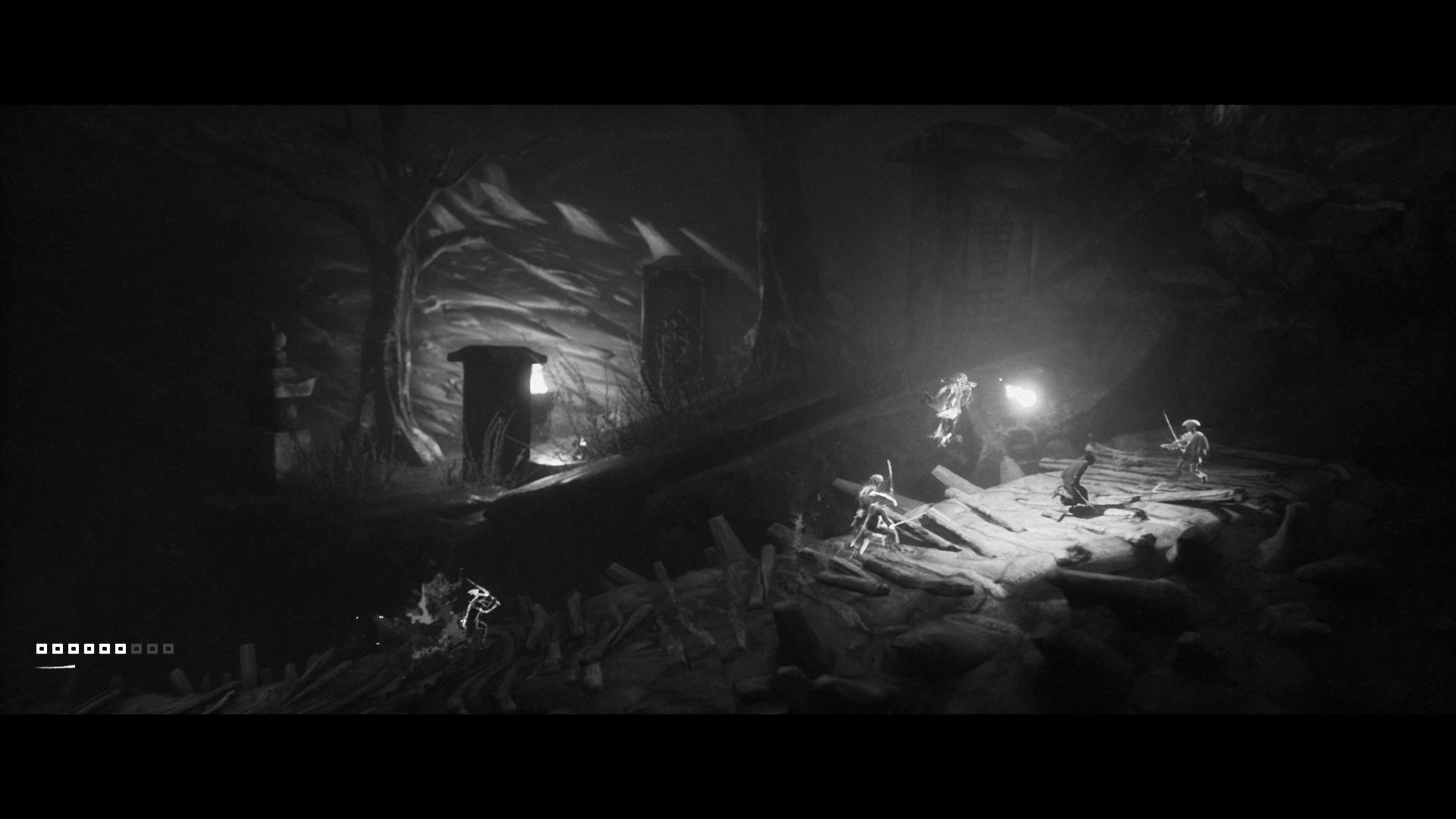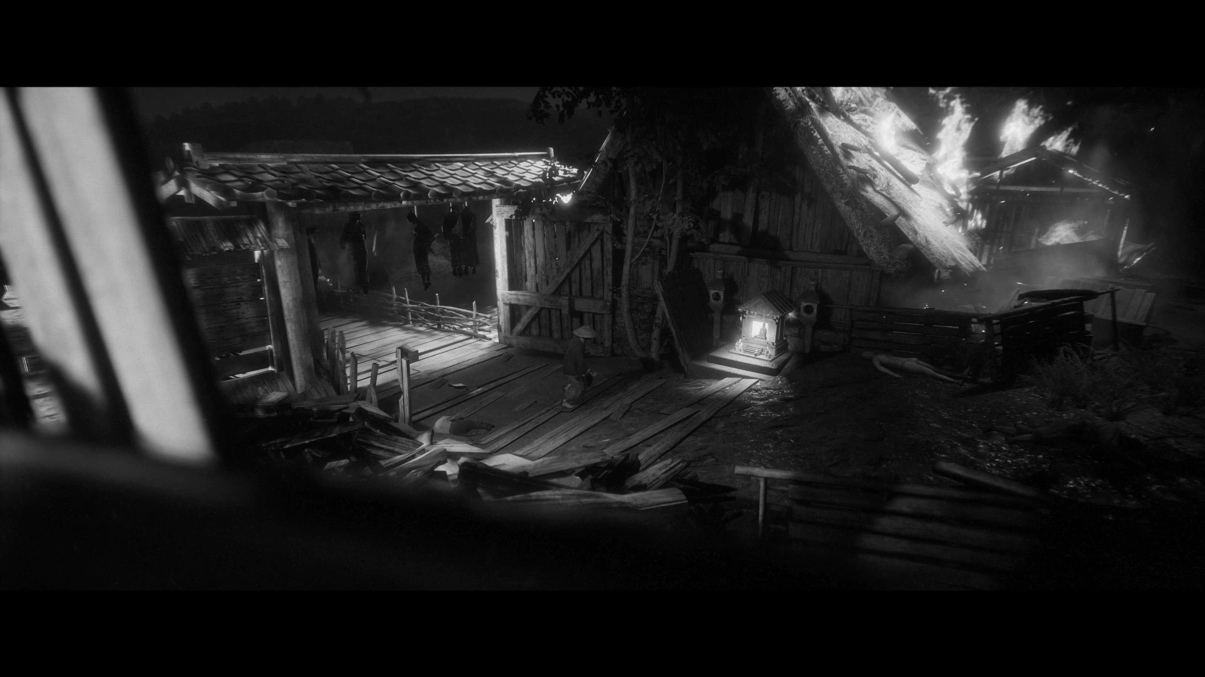 이 게임은 흑백 만으로도 낮, 흐림, 밤의 구분이 가능합니다. 고스트 오브 쓰시마도 흑백 모드가 있긴 하지만, 처음부터 흑백을 기준으로 만들지 않았기 때문에 낮과 밤의 구분도 힘들고, 어두운 장면에선 명암의 구분이 쉽지 않은 경우도 많이 있습니다. (플레이는 못 해보고 영상으로만 보긴 했지만요) 그래서 저는 전체적으로 아트가 많이 아쉬웠습니다. 하지만 이 게임은 시간대가 더 분명히 구분되고, 상황에 따라선 극단적으로 빛과 어둠을 사용하여 멋진 장면을 만들어 내기도 합니다. 단순히 흑백 필터를 입힌 수준이 아니라 처음부터 흑백을 고려하여 임팩트 있는 장면을 만들어 냈다는 얘기죠.