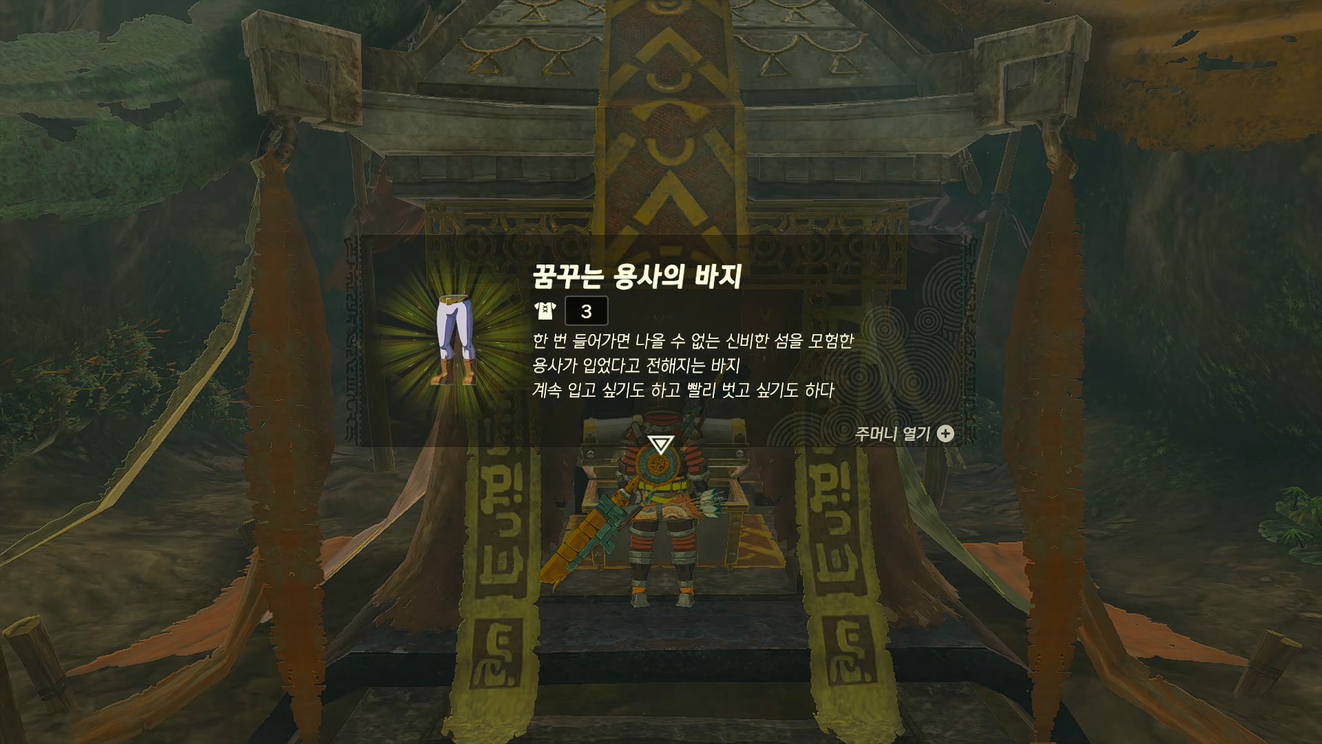 투기장 쭉 들어가 보면 꺼진 바닥이 있고 근처에 석상과 검이 있습니다. 검을 울트라 핸드로 들고 석상에 가져가면 동굴 문이 열립니다. 그 안 쪽에 들어가면 상자에 꿈꾸는 용사의 바지가 있습니다.