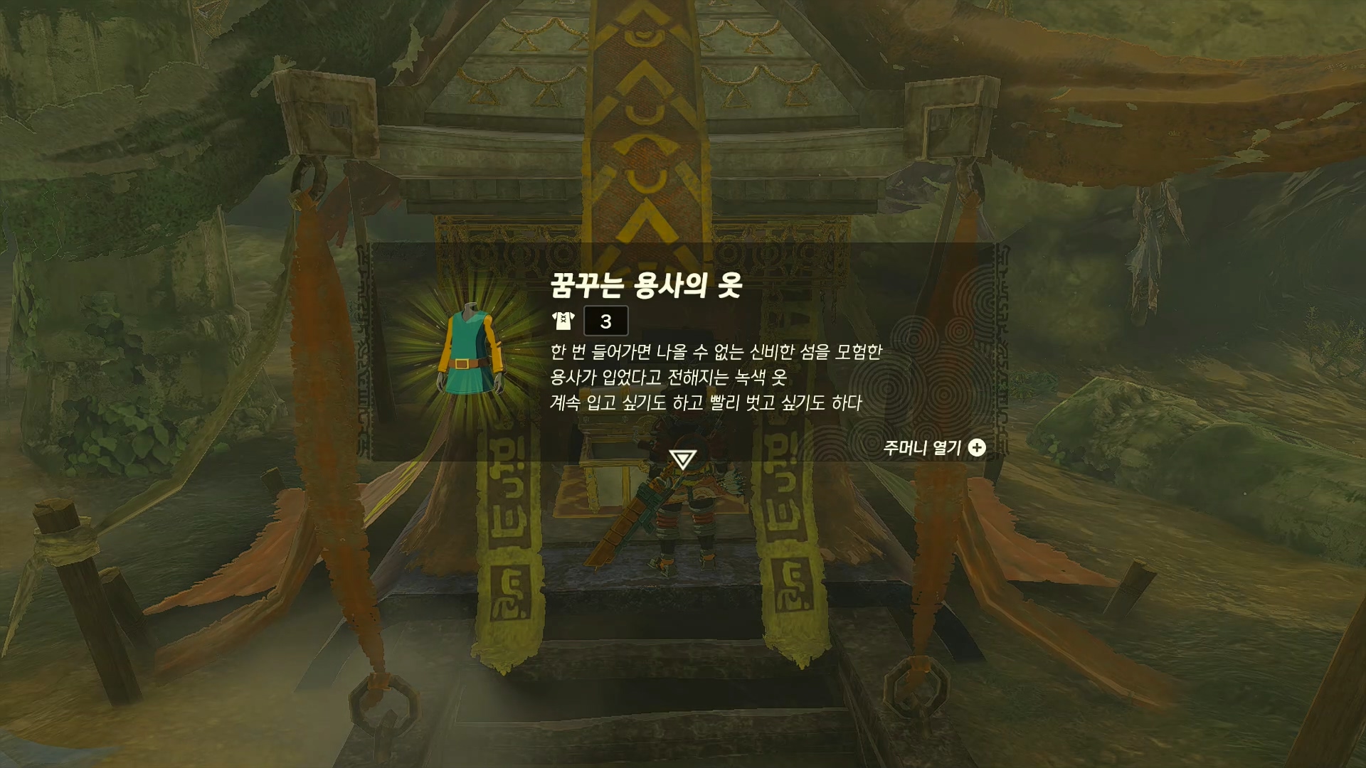상자에서 꿈꾸는 용사의 옷을 먹고 옆에 있는 비석을 조사하면 다음 퀘스트가 진행됩니다.